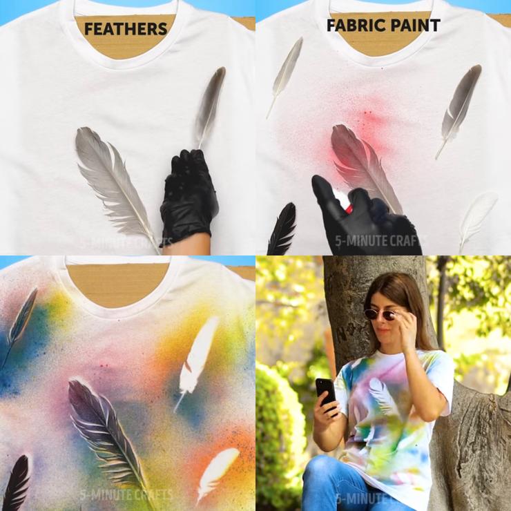 Последний вариант подойдет для видимых пятен на светлых вещах. Купите жидкую краску по ткани в пульверизаторах или в порошке, который вы должны развести и залить в пульверизаторы. Разложите футболку на застеленном пленкой столе, проложите ее картонкой под передней стороной. Положите на футболку несколько перьев — их также можно купить в магазине для декора или найти в зоопарке. Поверх перьев хаотично распылите краску. Дайте ей впитаться, а затем постирайте в машинке.