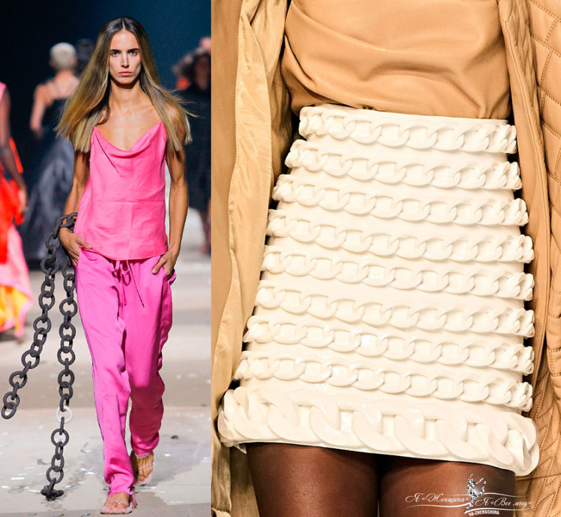 Один из главных трендов предстоящего сезона – это цепи. Цепи красуются везде, где можно, и просто, чтобы была. Крупные цепи вместо ремня, браслетов и чокера. В весенней коллекции цепей было очень много: на шее, на талии, в качестве топа и просто в руках, как шарф.