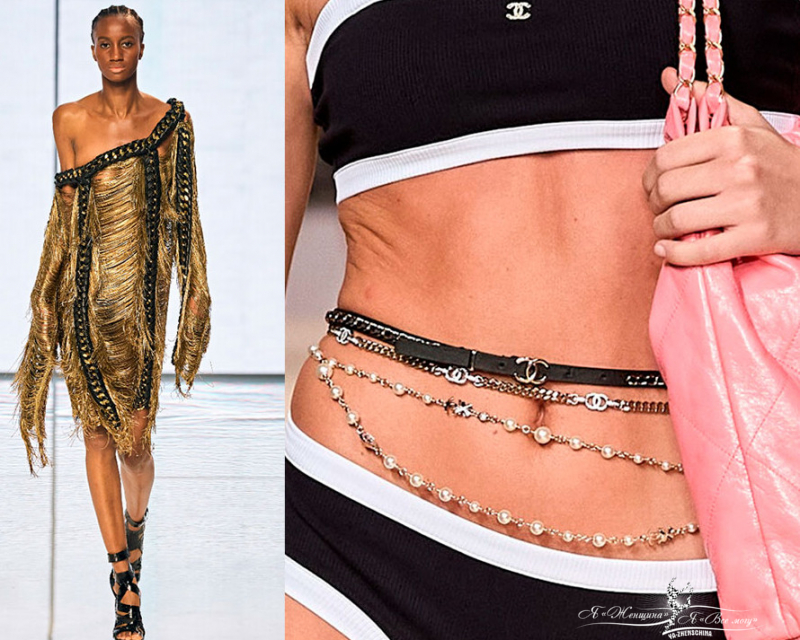Цепочка на талию, к этому украшению обратились многие известные бренды. Нам предлагают её носить, как на голое тело, так и на одежду, можно – по несколько штук одновременно.