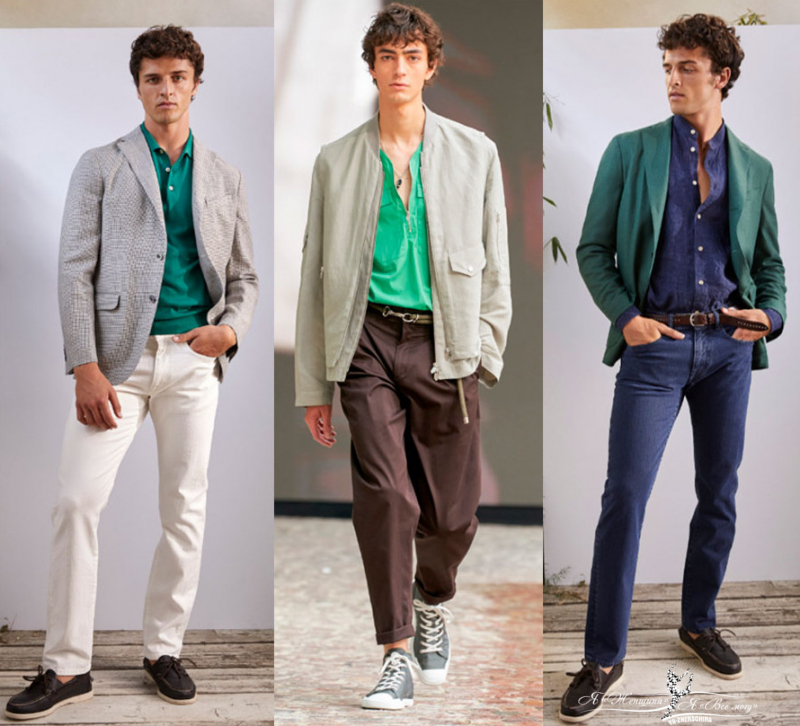 Зеленый на показах не только яркий, тотальный, но и приглушенно деликатный. Зеленой в образе может быть футболка поло, рубашка или пиджак. Любимый мужчинами цвет хаки мы не рассматриваем. Выбирая зеленый в верхней части комплекта, посмотрите, подходит ли он вам под глаза, не сделает ли он цвет лица болезненным.