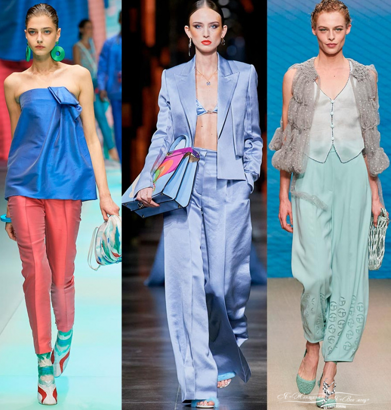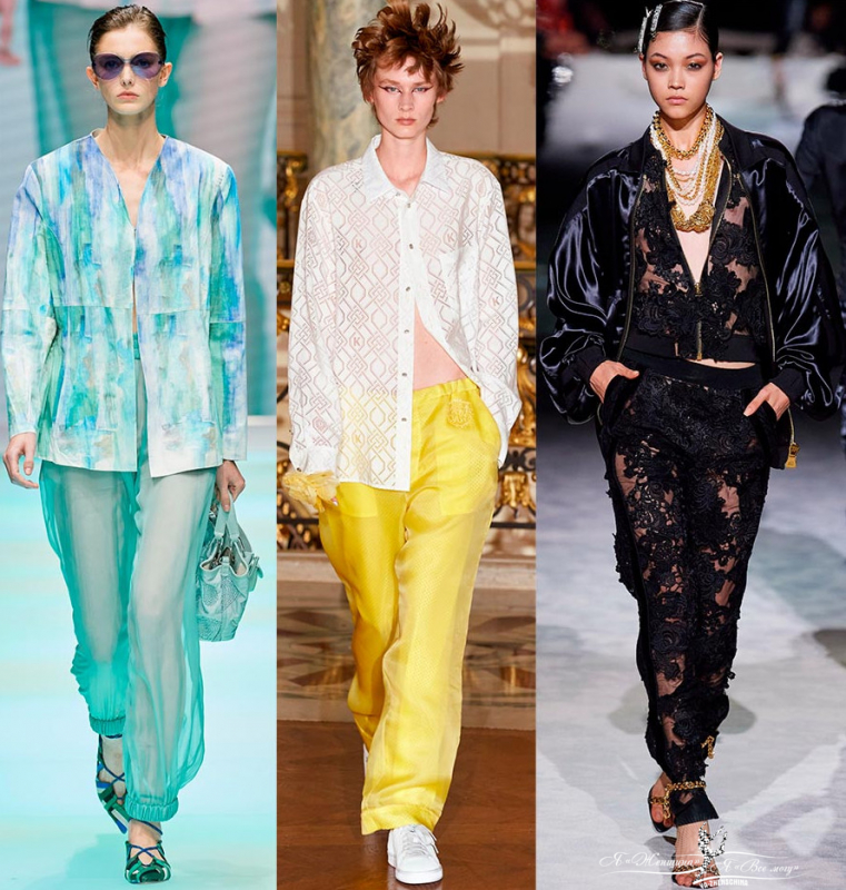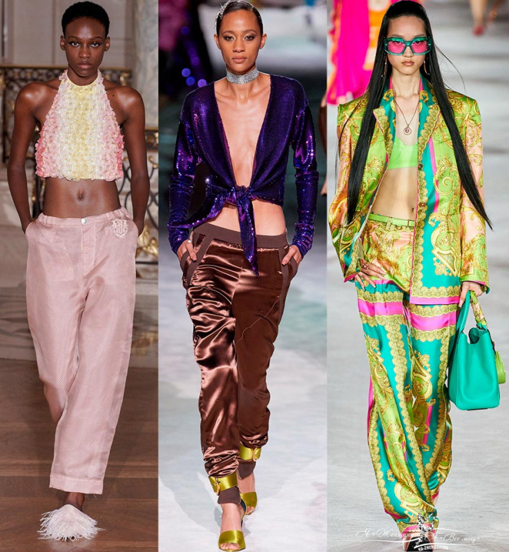 Атласные и шелковые брюки могут быть широкими и зауженными, их дополняют завязками или резинками на талии и на манжетах. Эффектные образы можно увидеть в коллекциях Emporio Armani, Fendi, Tom-Ford, Versace.
