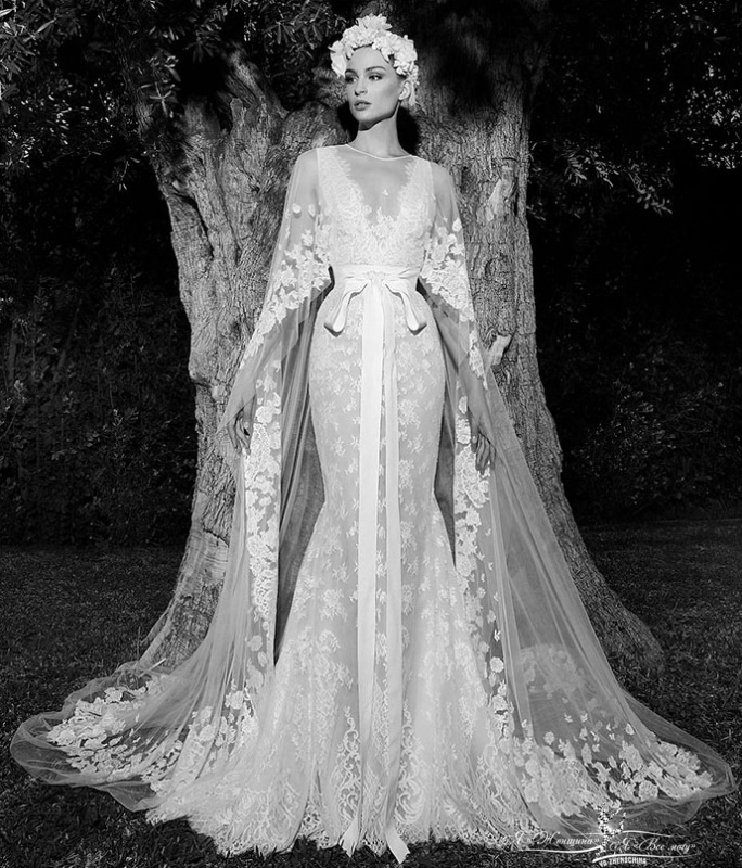 Кейп – это сочетание фаты и накидки. Одни из самых модных свадебных платьев в сезоне 2022 – это образы с кейпами. Кейпы могут быть как лаконичного кроя, так и украшены цветами, стразами и т.д.