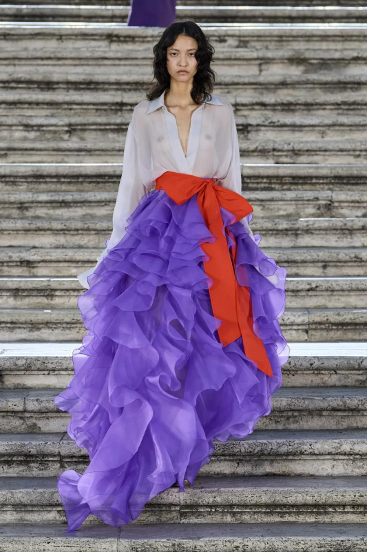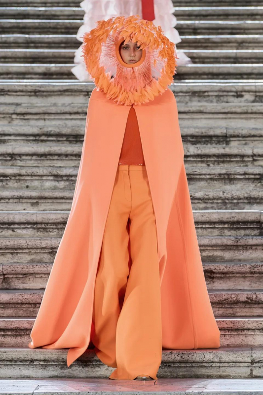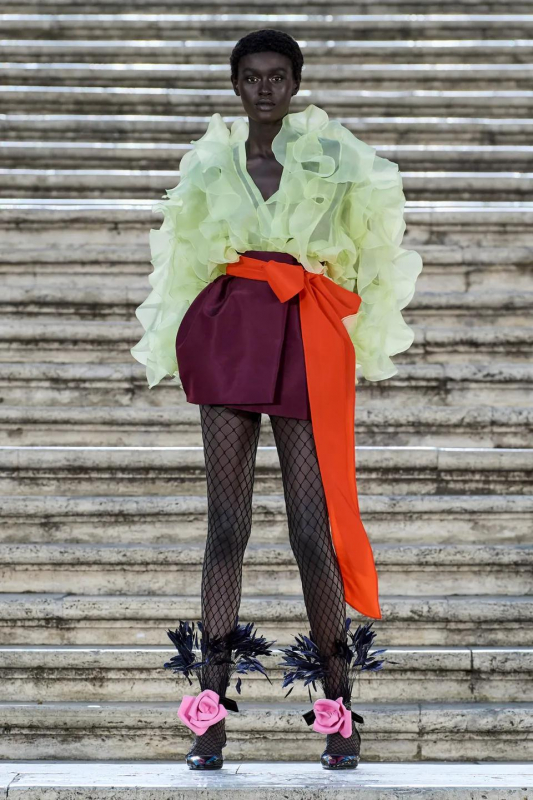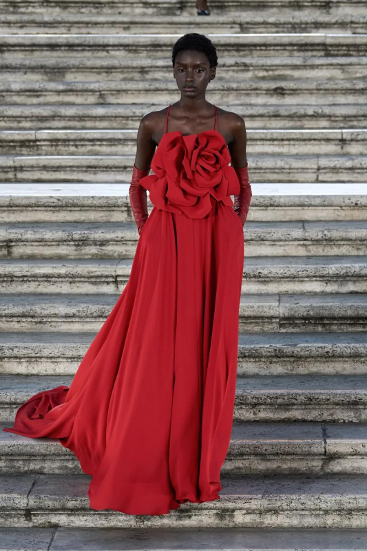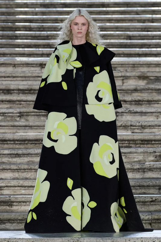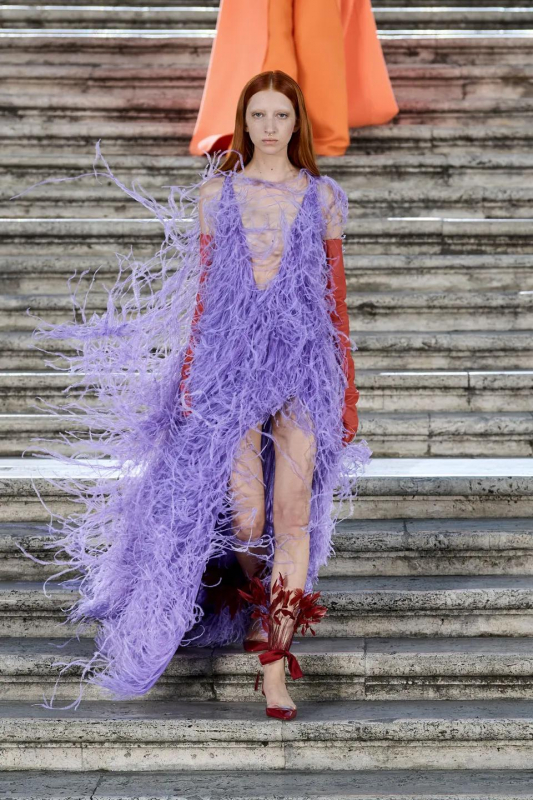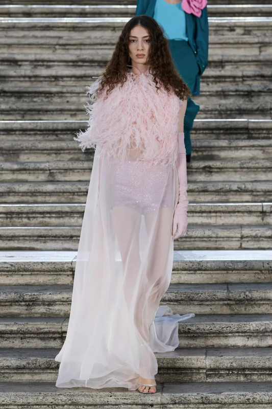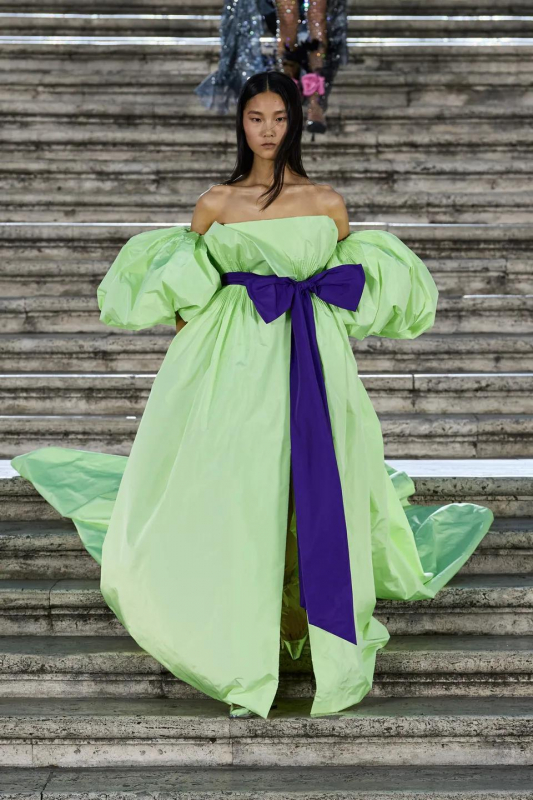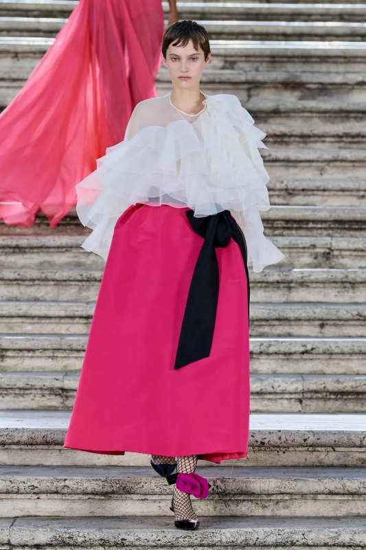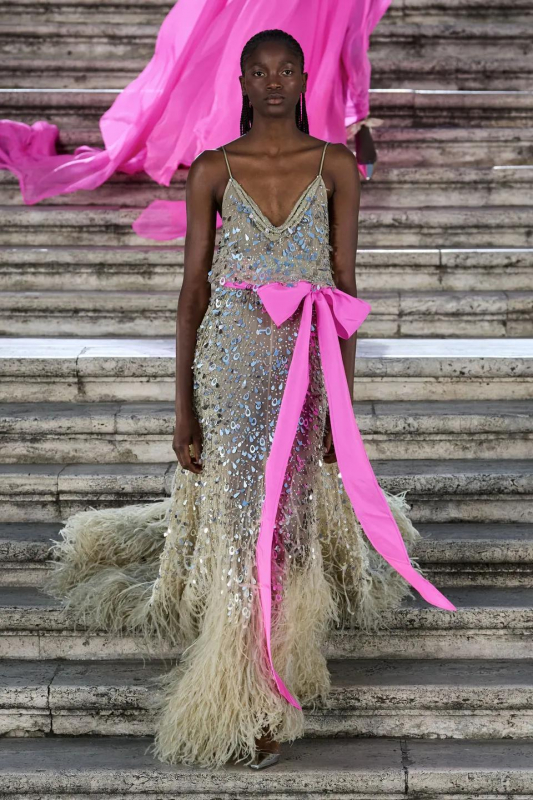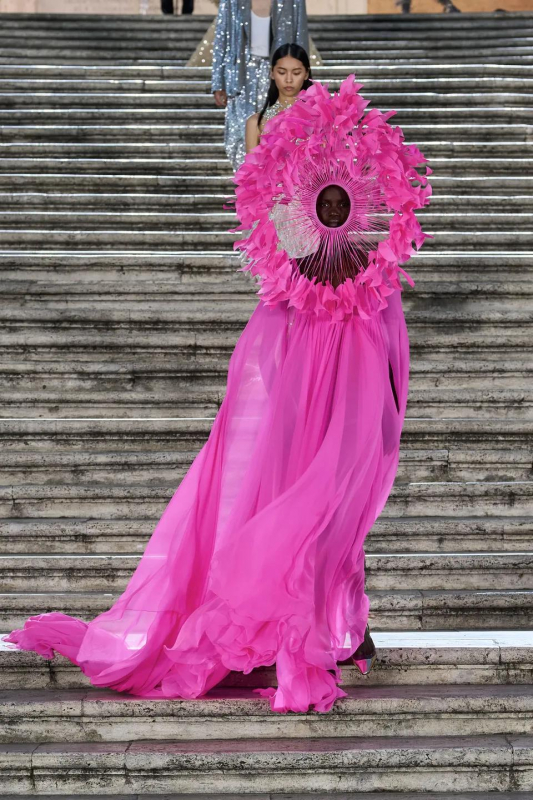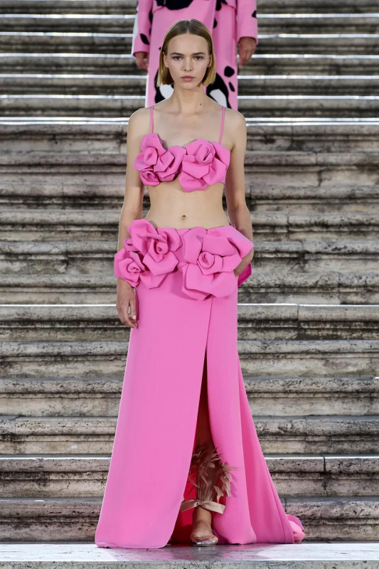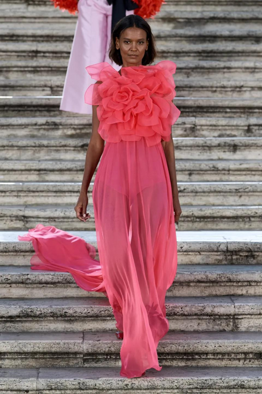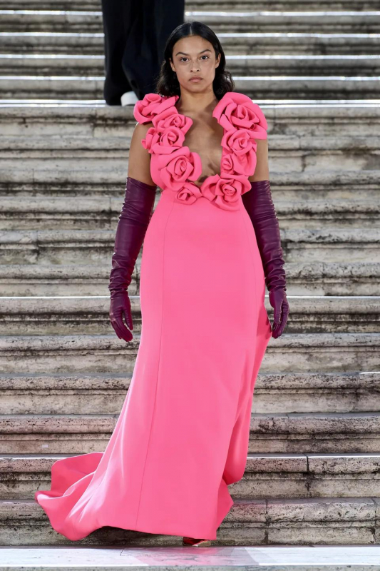 Прошлым вечером в Париже свою новую кутюрную коллекцию для Valentino представил Пьерпаоло Пиччоли — она получила название The Beginning. В этом сезоне дизайнер вновь активно работает с цветами: в прямом и переносном смысле. На подиуме мы увидели буйство ярких красок, а также отсылки к образам живых цветов: модели выходили на подиум в головных уборах-бутонах. Что касается оттенков, то тут Пиччоли показал богатую палитру, которая плавно сменялась вместе с настроением: в начале пышные платья, накидки и костюмы были окрашены в алый, затем появился уже фирменный розовый, который сменился на фиолетовый, кислотно-зелёный и оранжевый. «Отдыхом» от красок стали прозрачные платья и топы серебристого цвета: сияние — ещё один большой тренд коллекции.