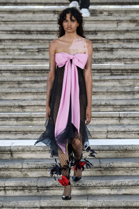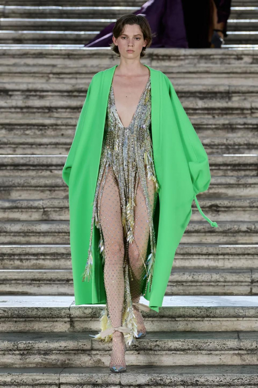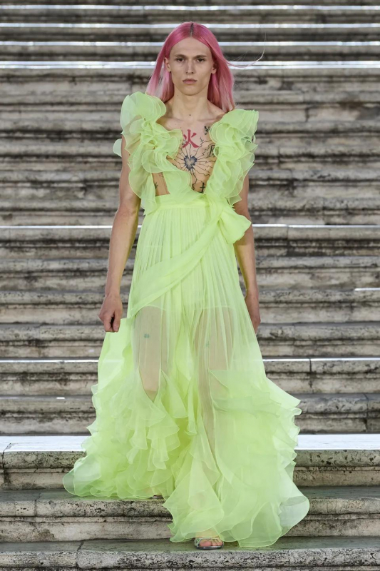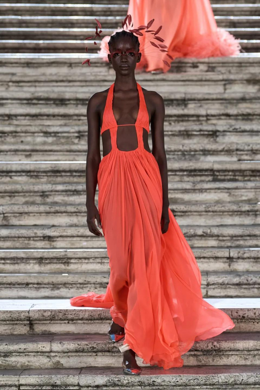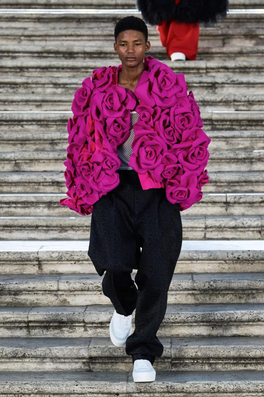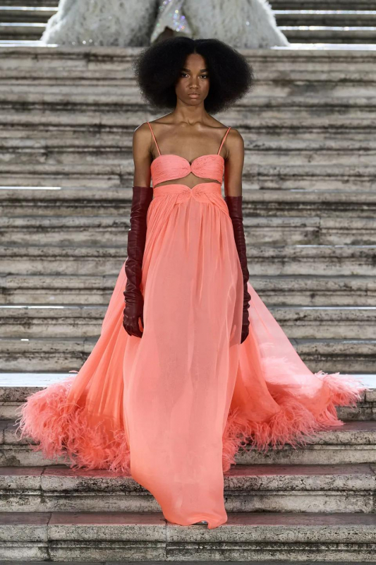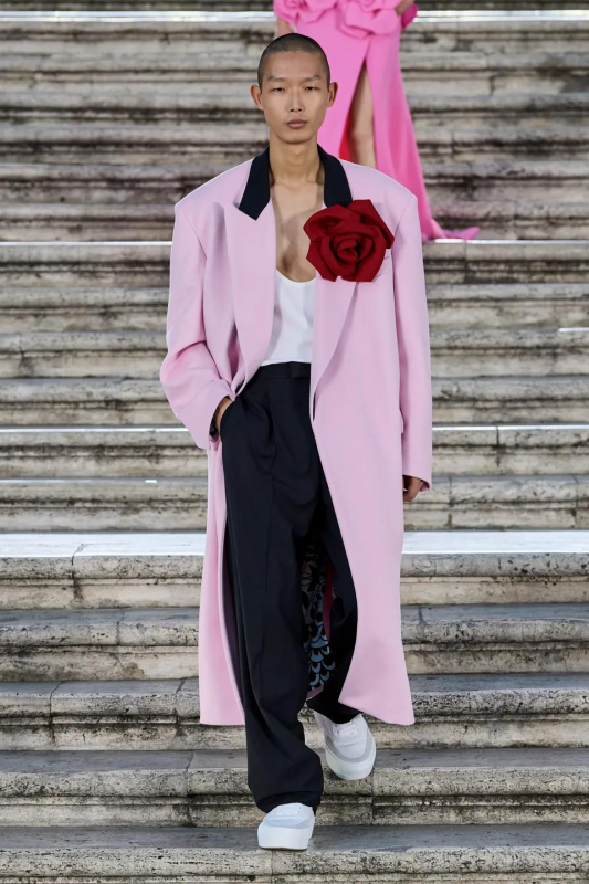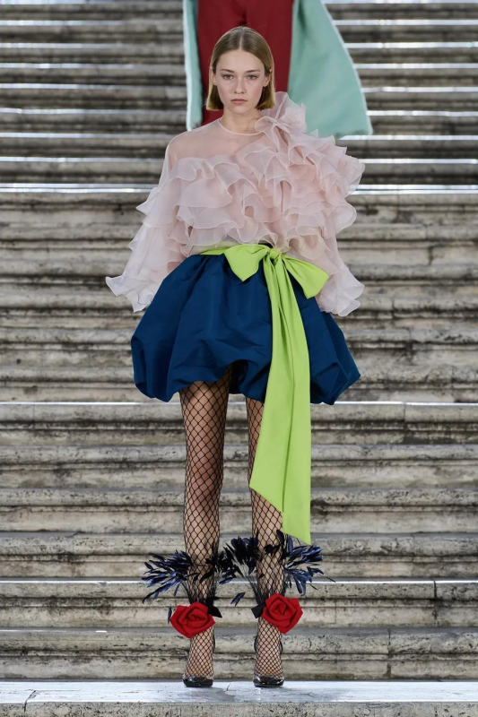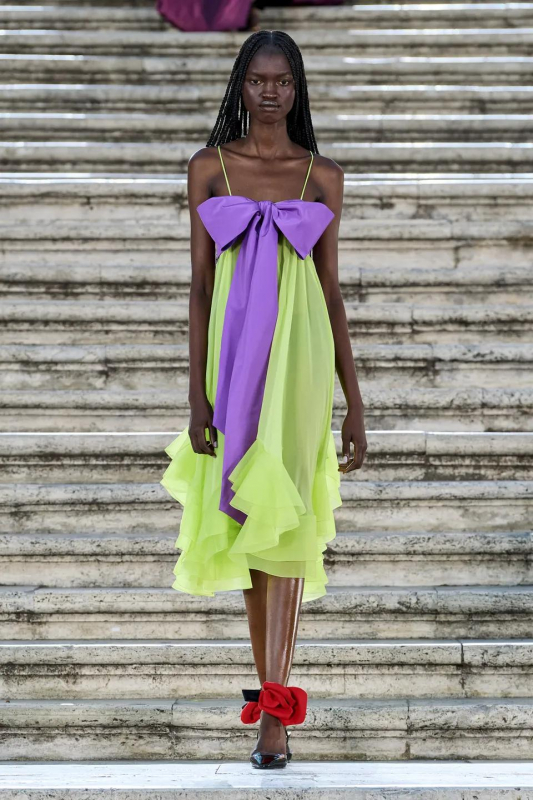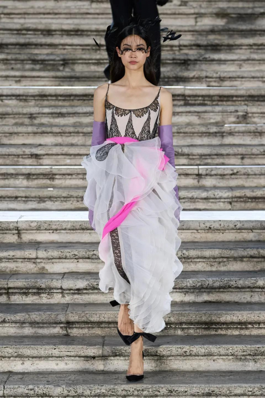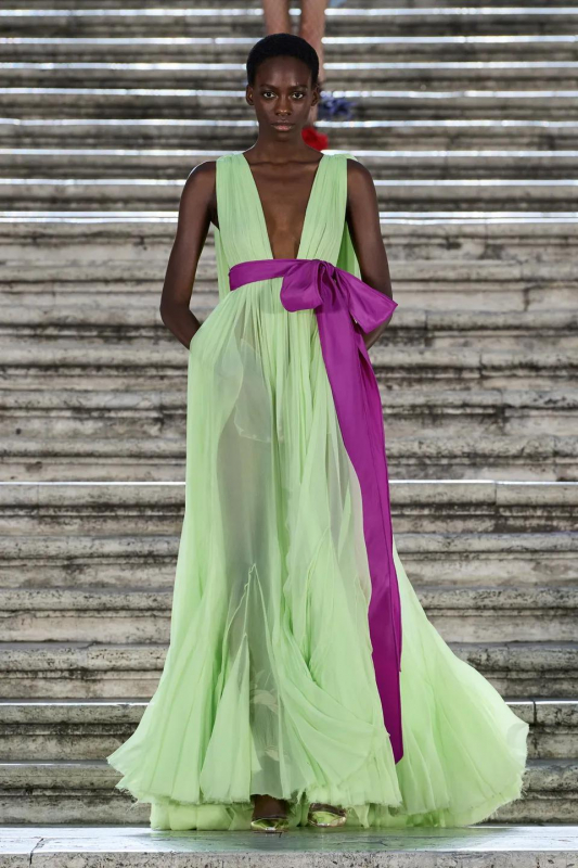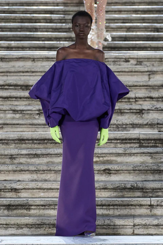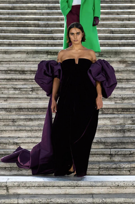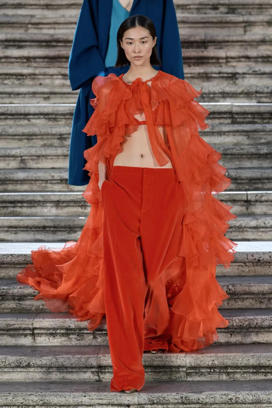Прошлым вечером в Париже свою новую кутюрную коллекцию для Valentino представил Пьерпаоло Пиччоли — она получила название The Beginning. В этом сезоне дизайнер вновь активно работает с цветами: в прямом и переносном смысле. На подиуме мы увидели буйство ярких красок, а также отсылки к образам живых цветов: модели выходили на подиум в головных уборах-бутонах. Что касается оттенков, то тут Пиччоли показал богатую палитру, которая плавно сменялась вместе с настроением: в начале пышные платья, накидки и костюмы были окрашены в алый, затем появился уже фирменный розовый, который сменился на фиолетовый, кислотно-зелёный и оранжевый. «Отдыхом» от красок стали прозрачные платья и топы серебристого цвета: сияние — ещё один большой тренд коллекции.