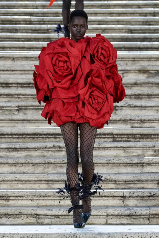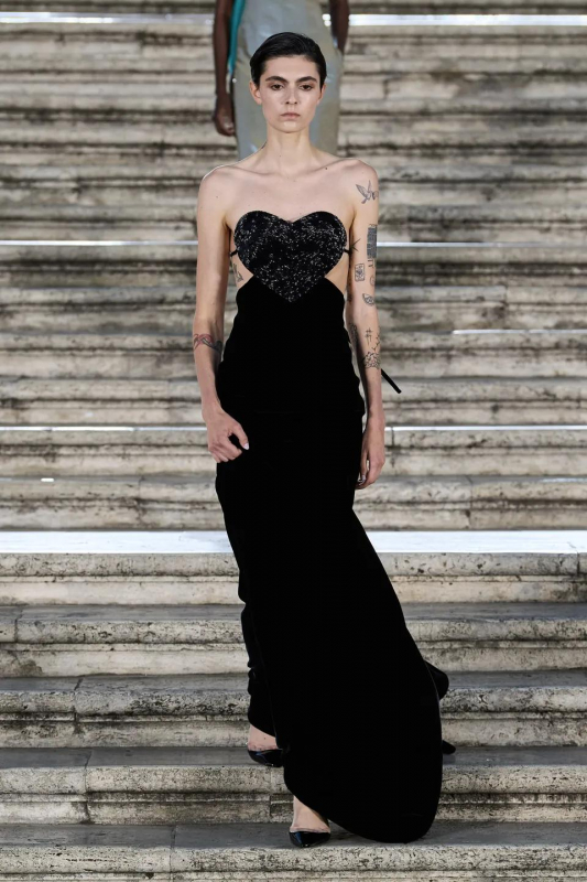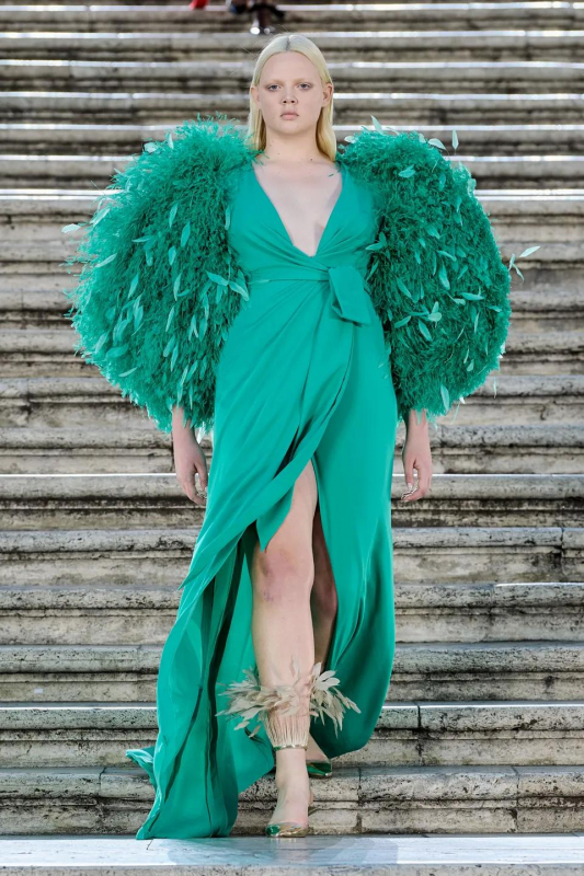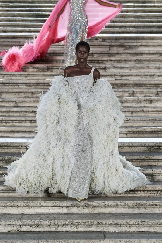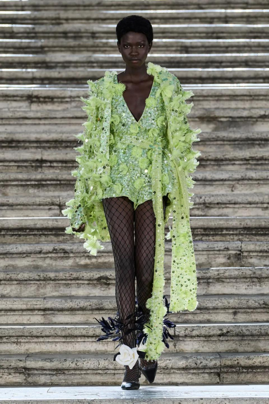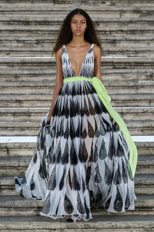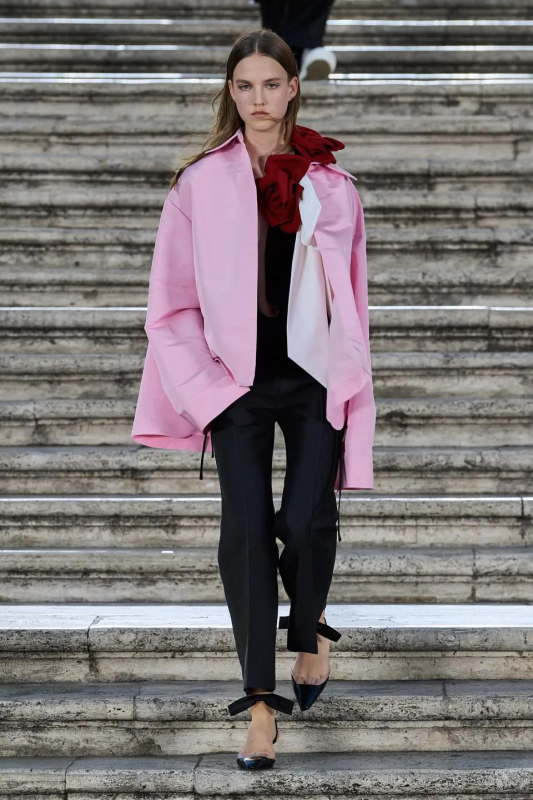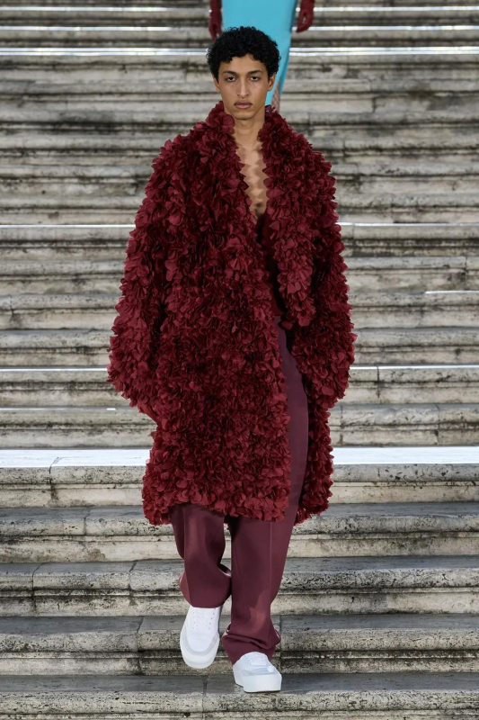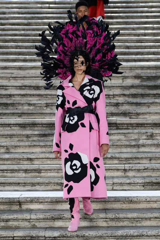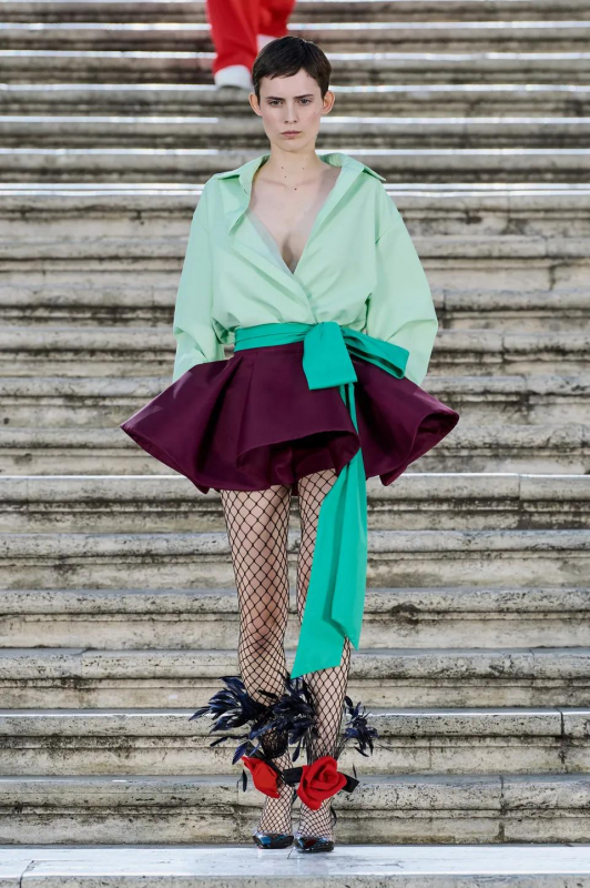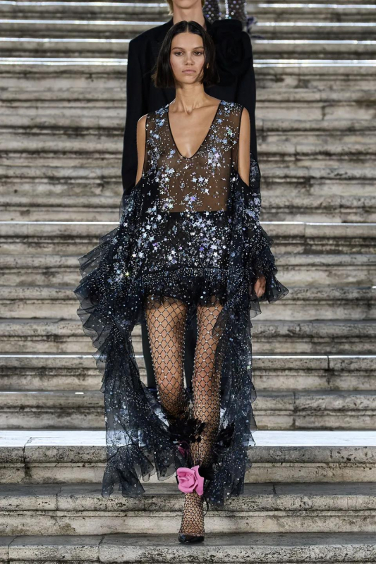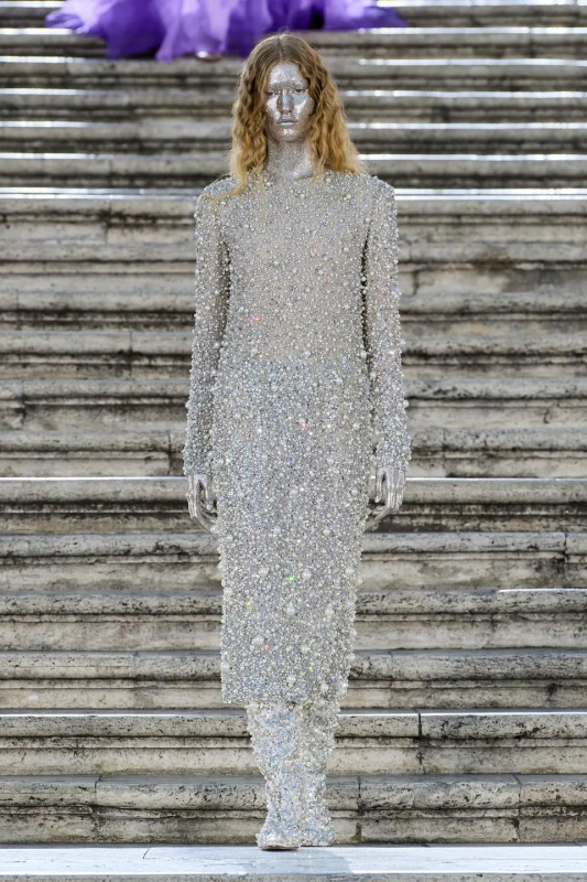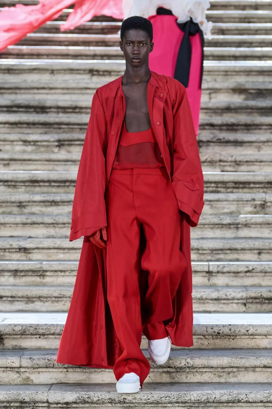 Прошлым вечером в Париже свою новую кутюрную коллекцию для Valentino представил Пьерпаоло Пиччоли — она получила название The Beginning. В этом сезоне дизайнер вновь активно работает с цветами: в прямом и переносном смысле. На подиуме мы увидели буйство ярких красок, а также отсылки к образам живых цветов: модели выходили на подиум в головных уборах-бутонах. Что касается оттенков, то тут Пиччоли показал богатую палитру, которая плавно сменялась вместе с настроением: в начале пышные платья, накидки и костюмы были окрашены в алый, затем появился уже фирменный розовый, который сменился на фиолетовый, кислотно-зелёный и оранжевый. «Отдыхом» от красок стали прозрачные платья и топы серебристого цвета: сияние — ещё один большой тренд коллекции.