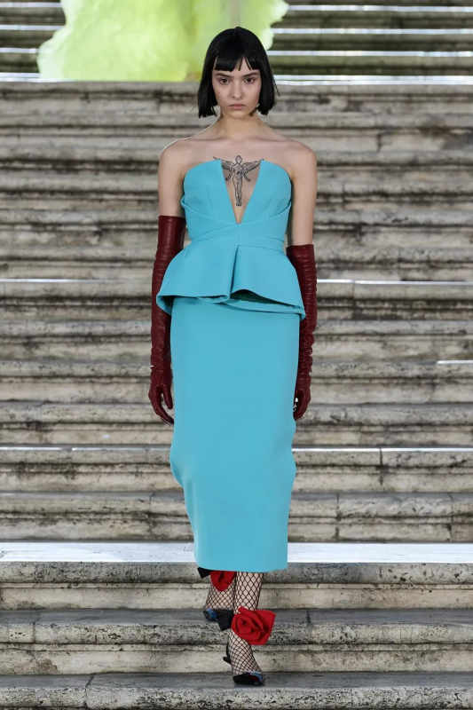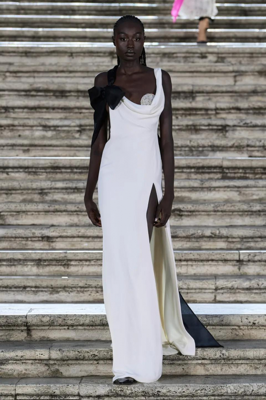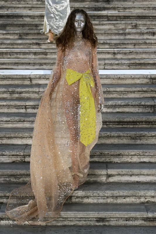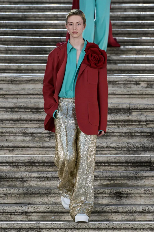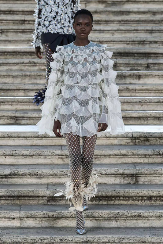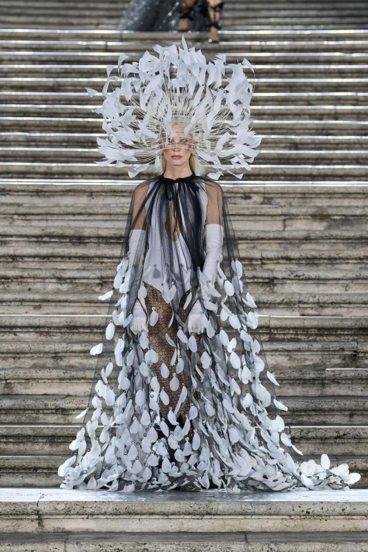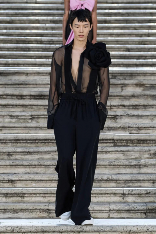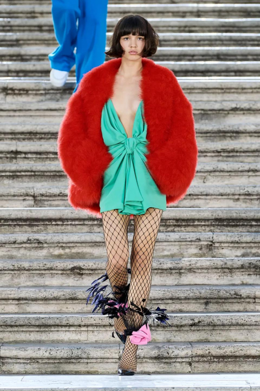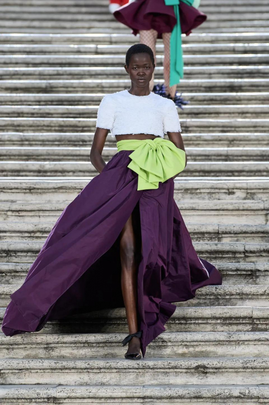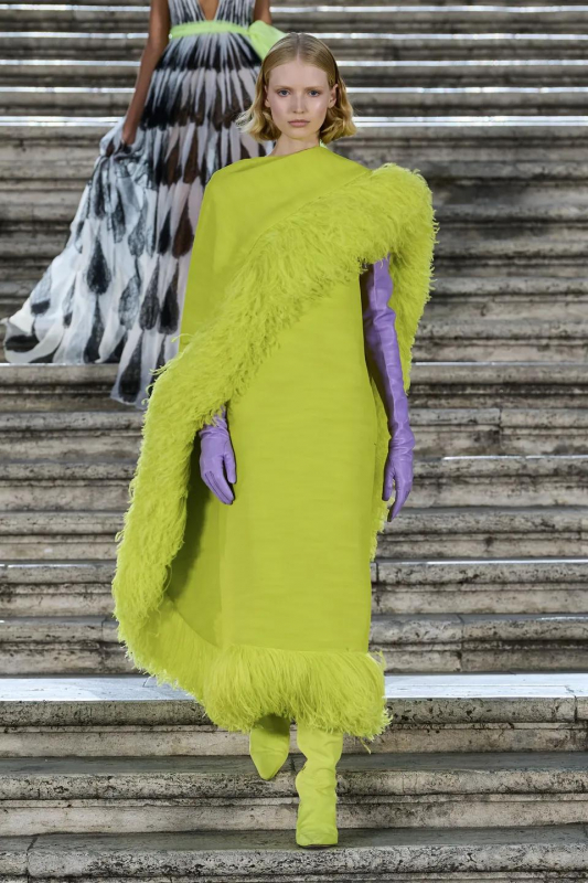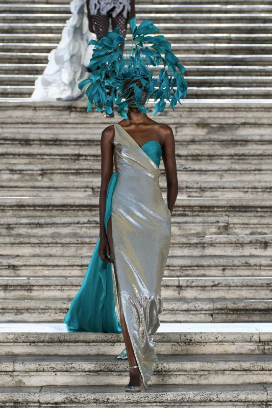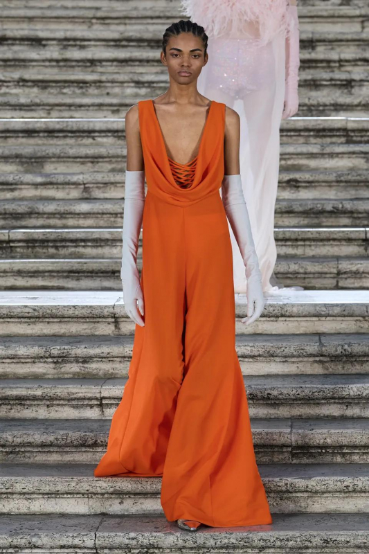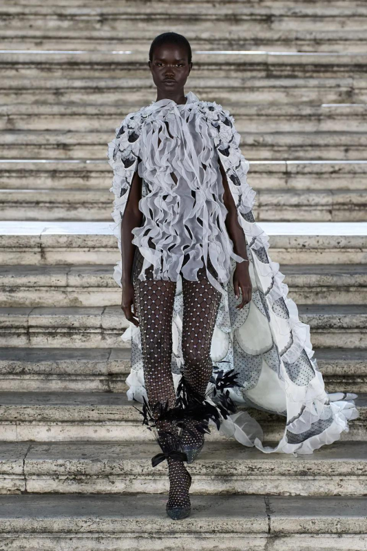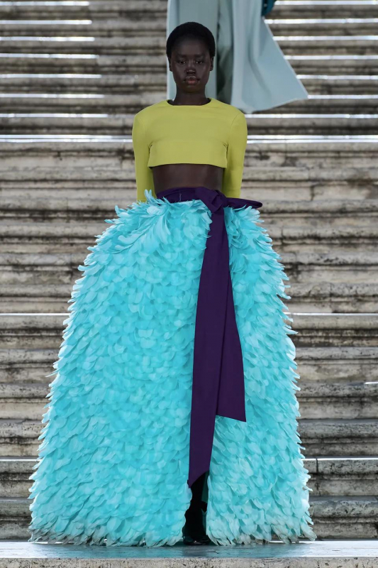Прошлым вечером в Париже свою новую кутюрную коллекцию для Valentino представил Пьерпаоло Пиччоли — она получила название The Beginning. В этом сезоне дизайнер вновь активно работает с цветами: в прямом и переносном смысле. На подиуме мы увидели буйство ярких красок, а также отсылки к образам живых цветов: модели выходили на подиум в головных уборах-бутонах. Что касается оттенков, то тут Пиччоли показал богатую палитру, которая плавно сменялась вместе с настроением: в начале пышные платья, накидки и костюмы были окрашены в алый, затем появился уже фирменный розовый, который сменился на фиолетовый, кислотно-зелёный и оранжевый. «Отдыхом» от красок стали прозрачные платья и топы серебристого цвета: сияние — ещё один большой тренд коллекции.