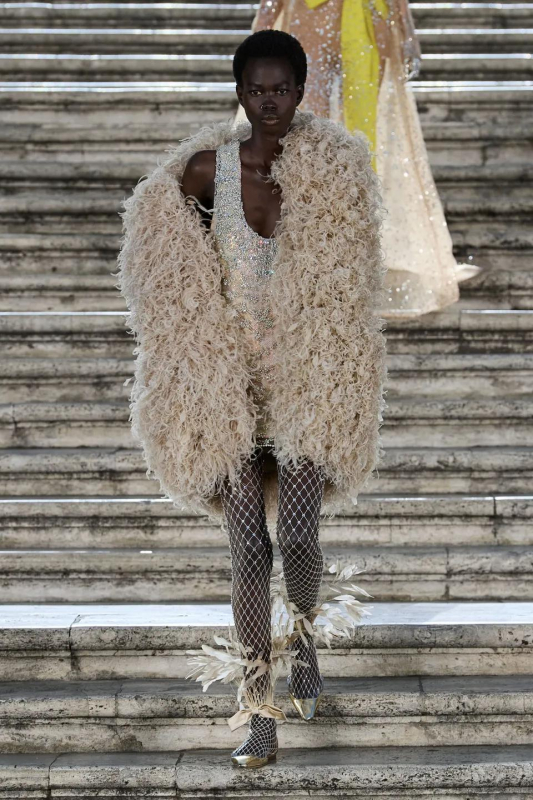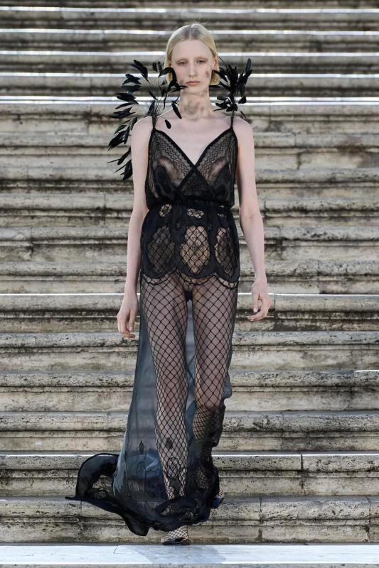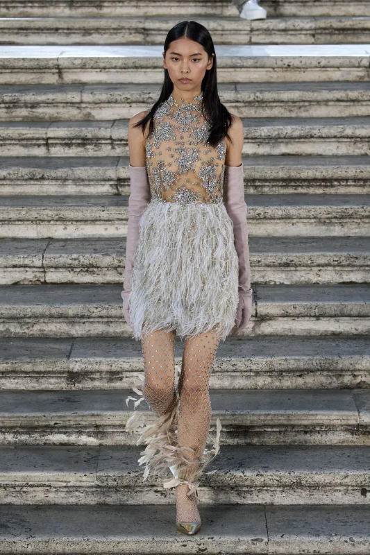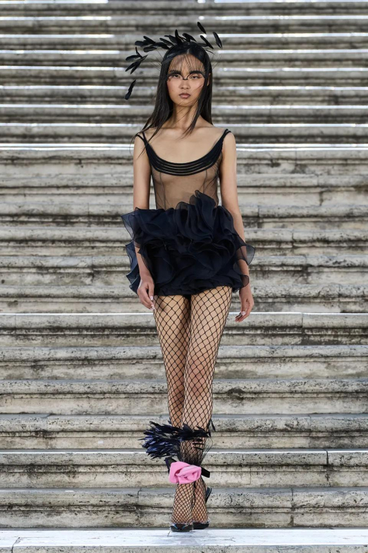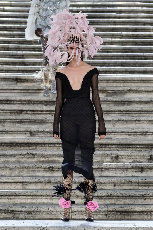 Особого внимания заслуживают детали: босоножки и балетки, украшенные перьями, сетчатые колготки, высокие перчатки и броши в виде роз — определенно, главные мастхэвы сезона.