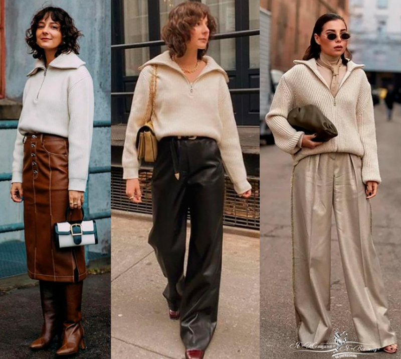 Свитер с горловиной на молнии может быть длинным плотной вязки и коротким облегающим из тонкого трикотажа. Сочетаем с широкими джинсами и брюками.