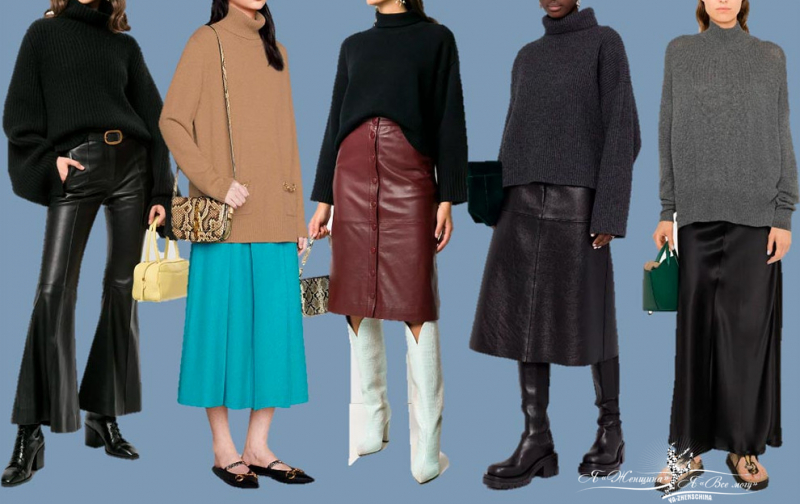 В тренде водолазки базовых цветов. Комбинируйте их с широкими брюками, джинсами, классическими юбками из шерсти и кожи. Водолазка практична и подходит для создания многослойных образов. Ремни, цепочки и кулоны украсят образ с водолазкой.
