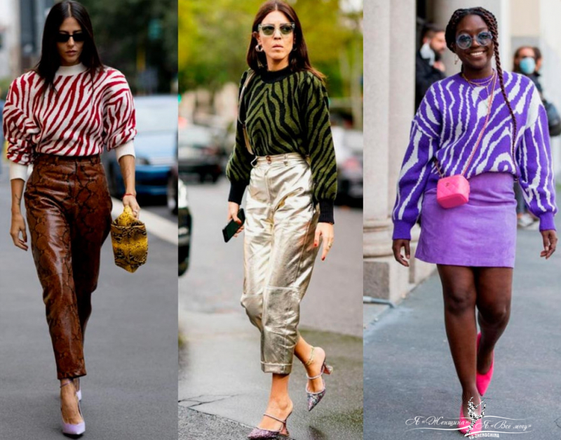 Анималистичный принт не выходит из моды, крой у свитера может быть любой, а вот джинсы, юбку и обувь выбирайте модную.