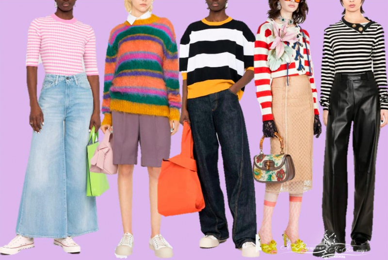Свитер в полоску украсьте металлическими пуговицами в стиле «Бальмен» и объемными брошами в форме цветов.