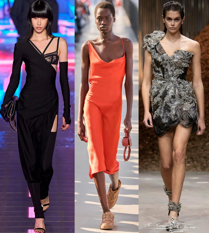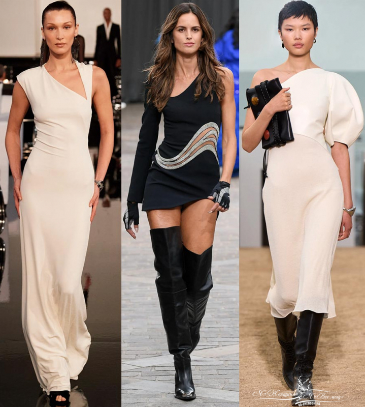 - Ассиметричный крой. Одно голое плечо — это уже классика, но до сих пор в моде!