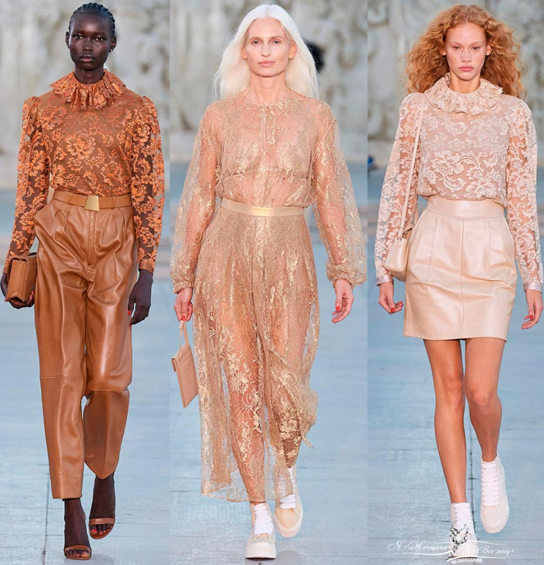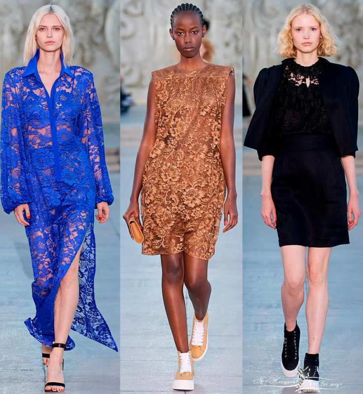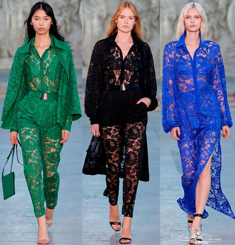 Наконец, использование кружевных материалов. Гипюровое кружево разных цветовых оттенков, известное не только в Швейцарии, украшает многие модели последней коллекции. Кружевная ткань вносит роскошь в образы независимо от того блузки ли это, платья или даже комбинезоны.
