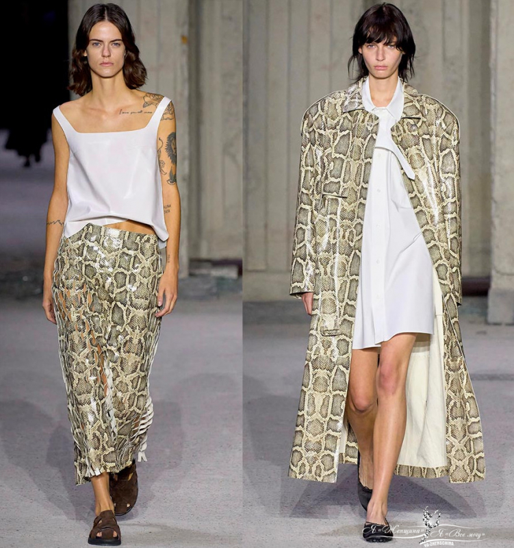 Чтобы змеиный принт раскрылся на ткани во всей красе, ткань не должна быть слишком тонкой и тем более полупрозрачной. Лучше всего смотрятся платья, юбки и другая одежда из плотной ткани. Шикарно смотрится экокожа под питона и натуральная кожа с тиснением и окрасом. В коллекциях весна-лето 2023, есть плащи, костюмы, юбки, топы, лонгсливы, блузки и вообще любые другие вещи со змеиным принтом.