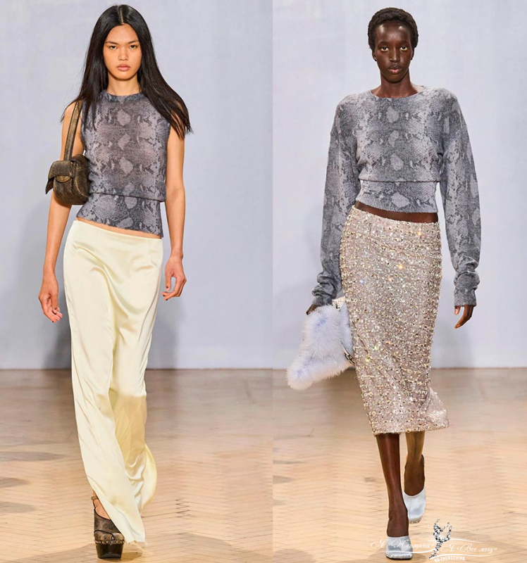 16 Arlington предлагает стильные комплекты серых оттенков, в некоторых случаях сочетая змеиный принт с пайетками, тем самым вещь включает в себя сразу 2 модных тренда. Пайетки могут имитировать чешуйки змеиной кожи, и кажется, будет идеальное сочетание, но на практике принт размывается и теряется за блеском пайеток.