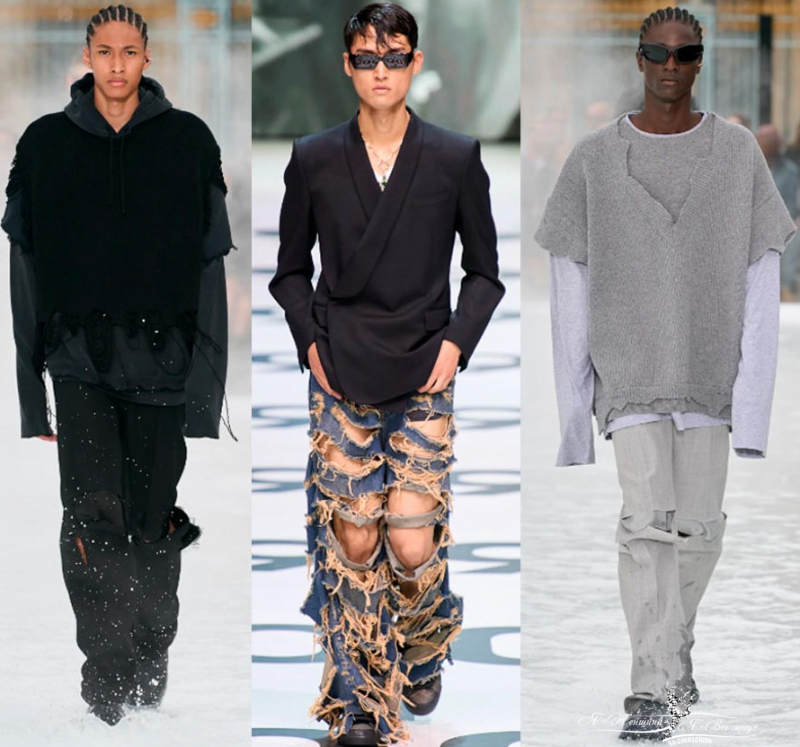 Драными могут быть не только джинсы, но и свитера, чем сложнее дыры, тем лучше. При стилизации можно уйти в гранж или сочетать драные джинсы с классическим пиджаком.