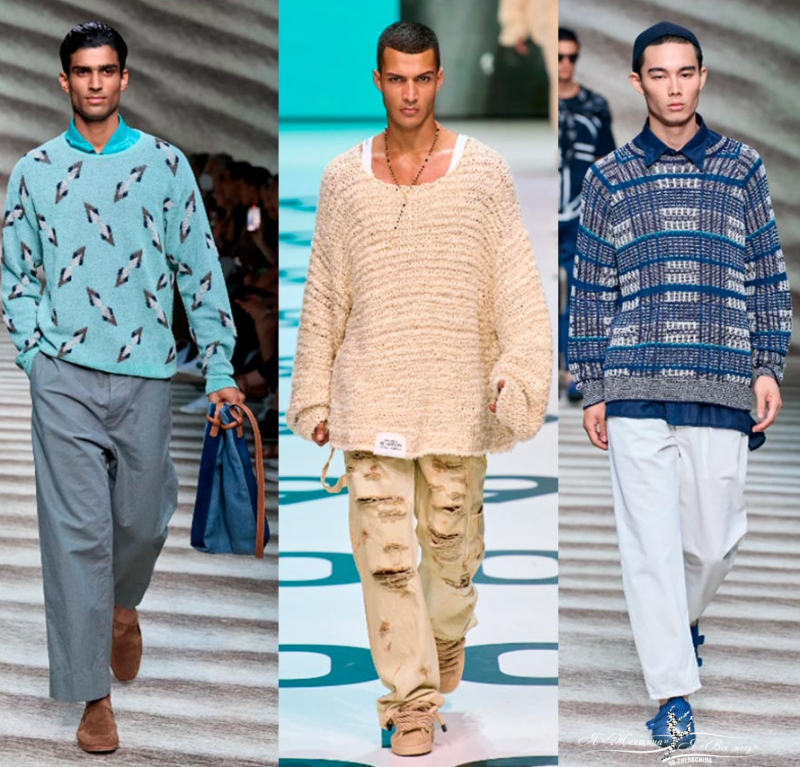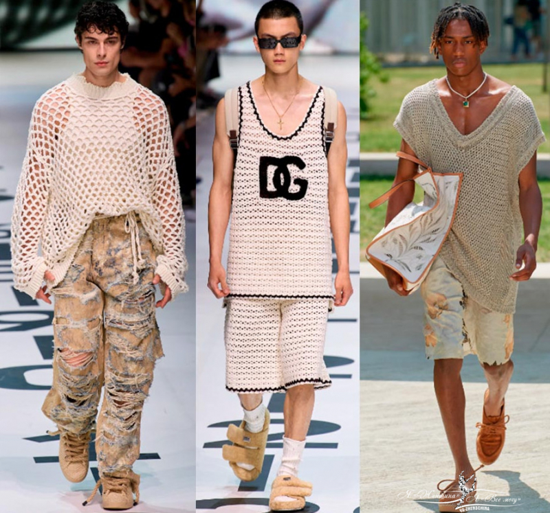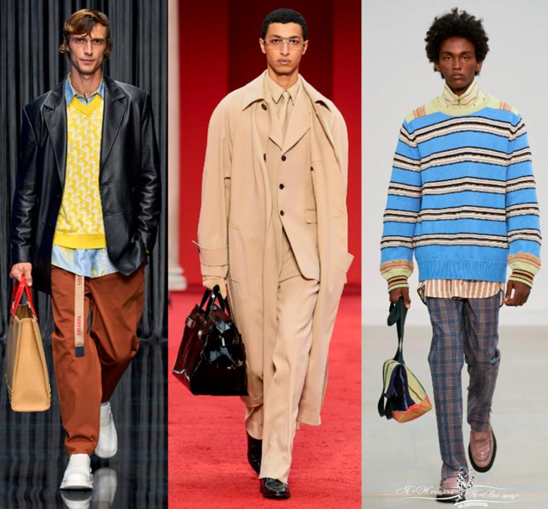 Вязаные футболки сочетаем с классическими брюками и шортами. В моде объемные мужские сумки.