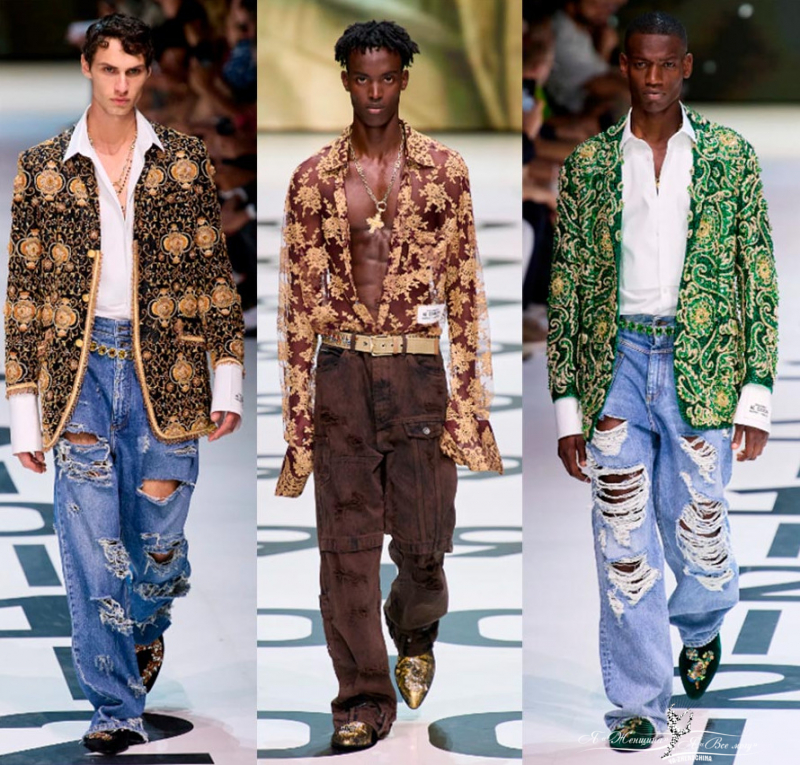 Создать остромодный образ просто. В современном мужском гардеробе должны быть широкие джинсы и белая рубашка, останется только приобрести или сшить пиджак из парчи.