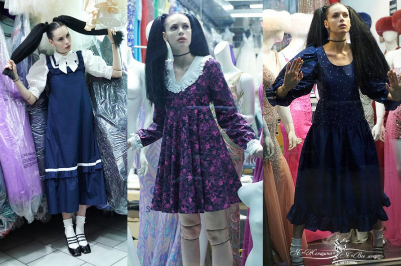 Платья подчеркивают талию и грудь, повторяя крой кукольных и детских нарядов.