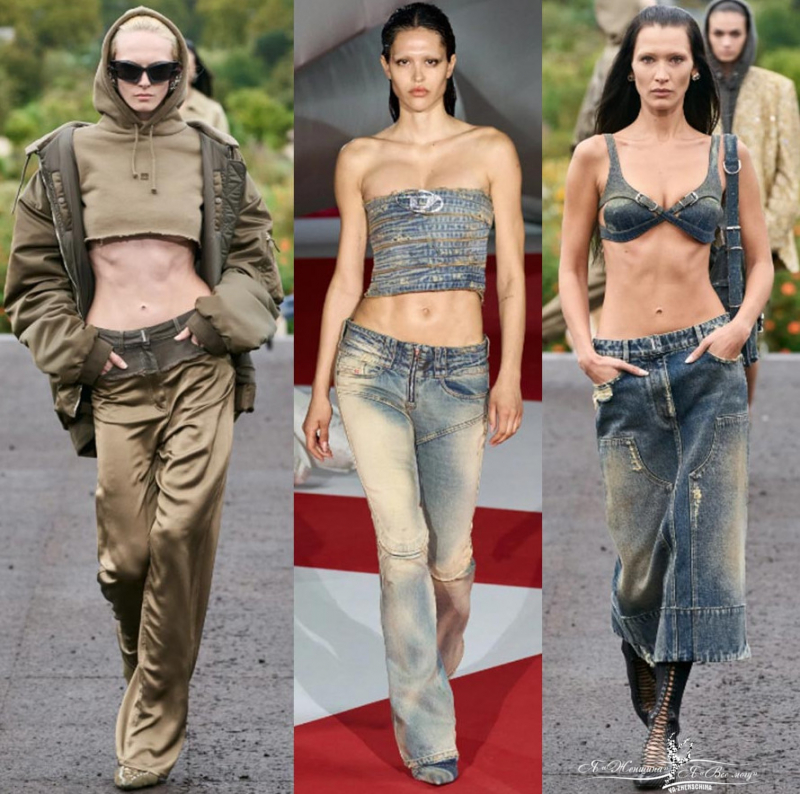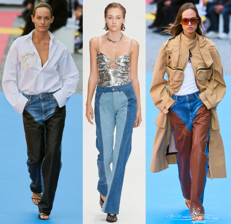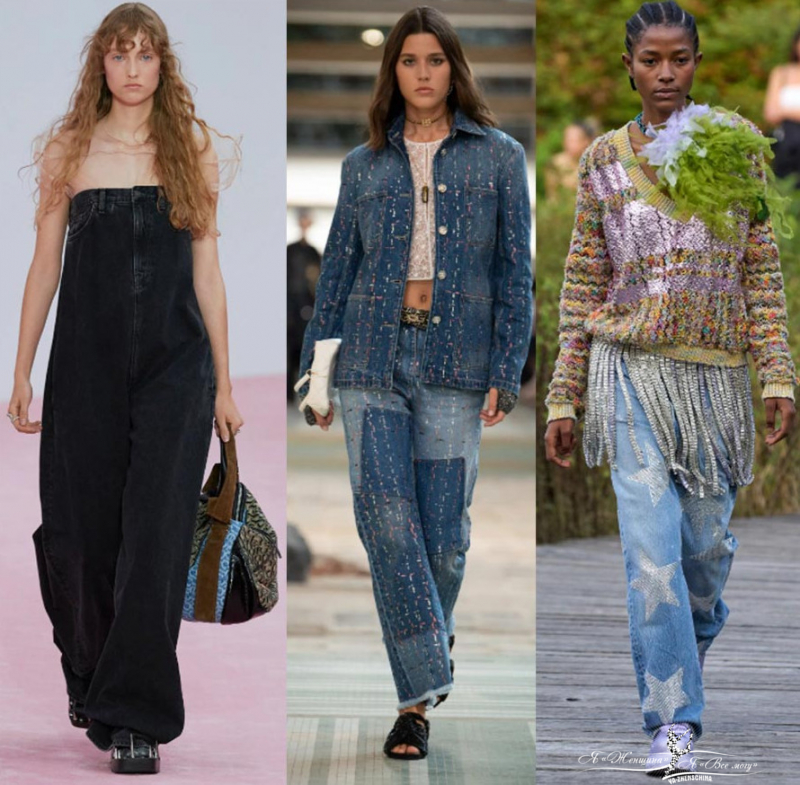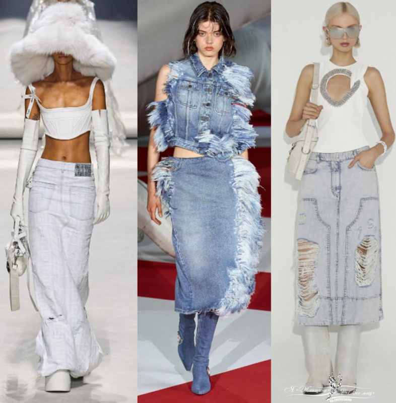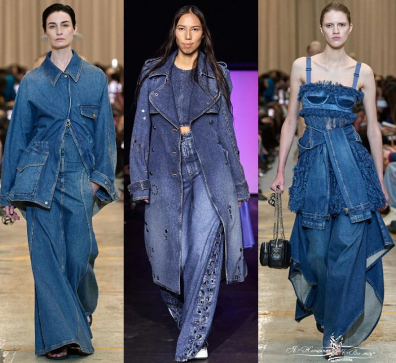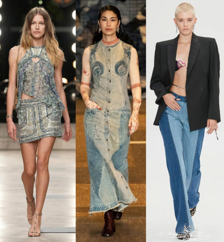 Необычные изделия из джинсовой ткани. Платья нестандартные, длинные джинсовые юбки, полностью образы из денима, джинсы с кожаными вставками. Много примеров у Marine Serre, Burberry, Дизель, Stella McCartney, Nensi Dojaka, Altuzarra. Вещи похожие больше на произведение искусства.