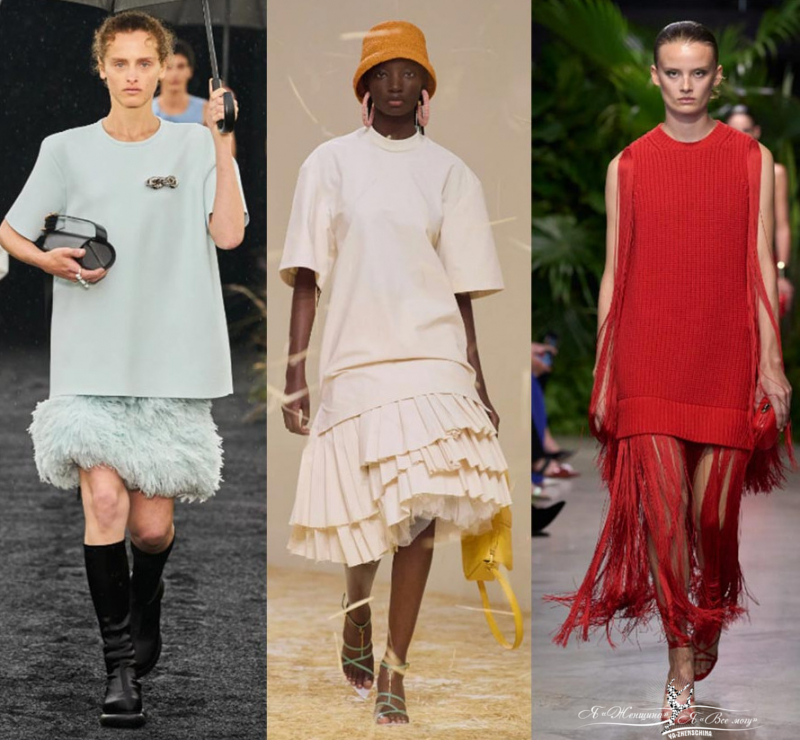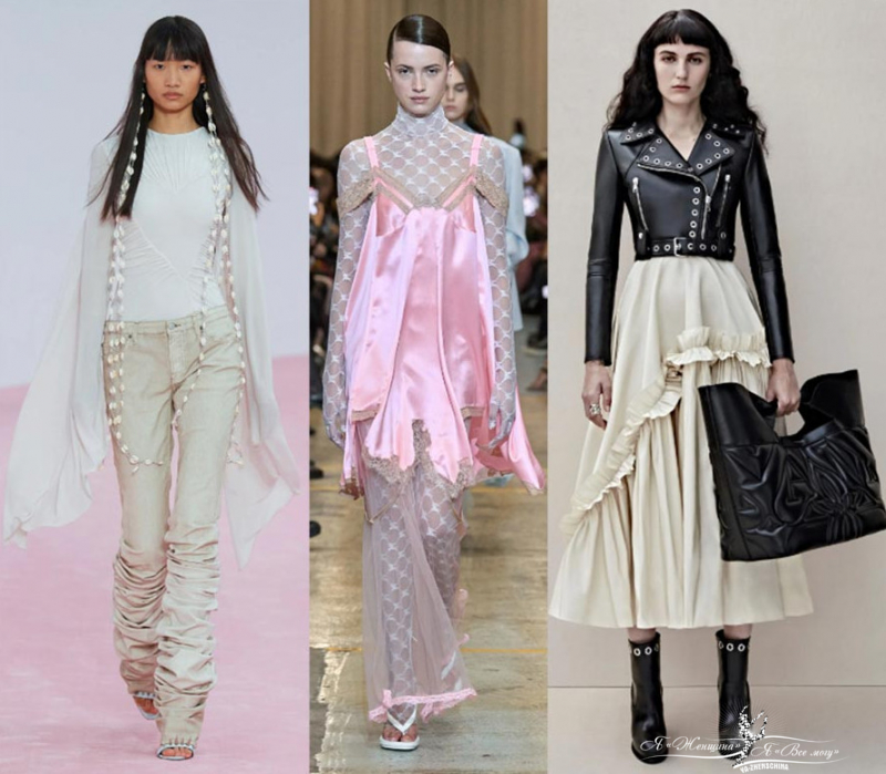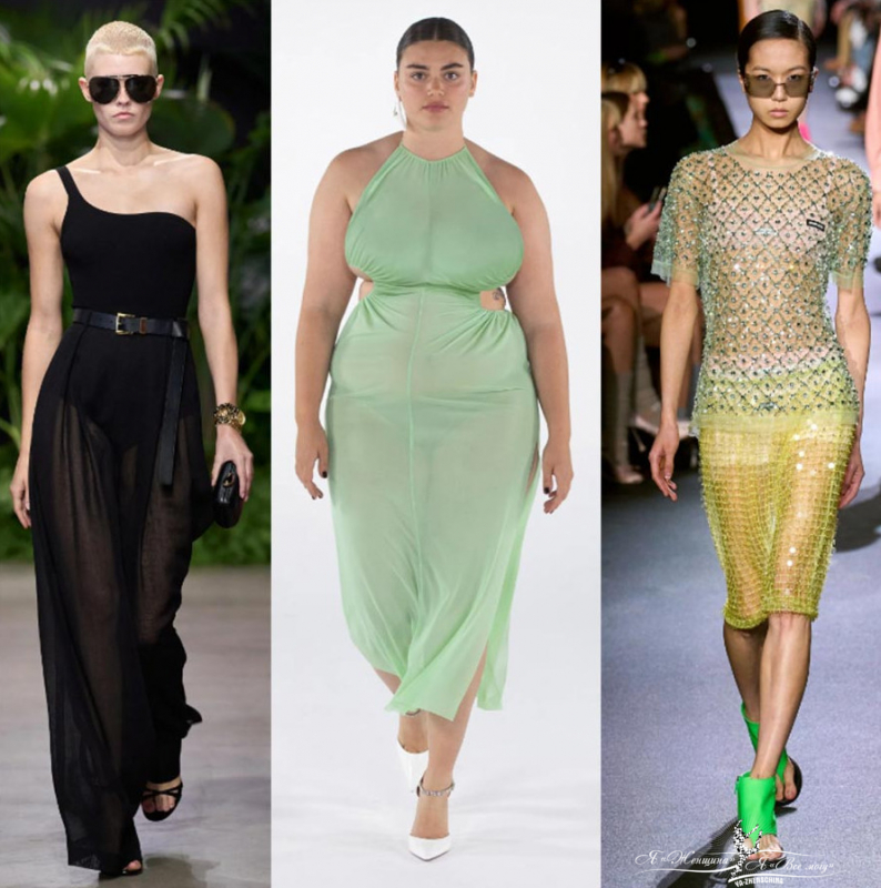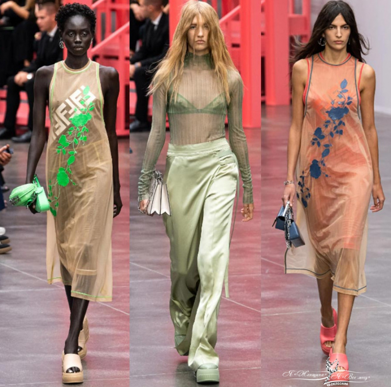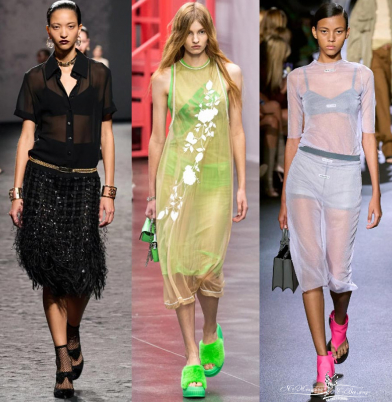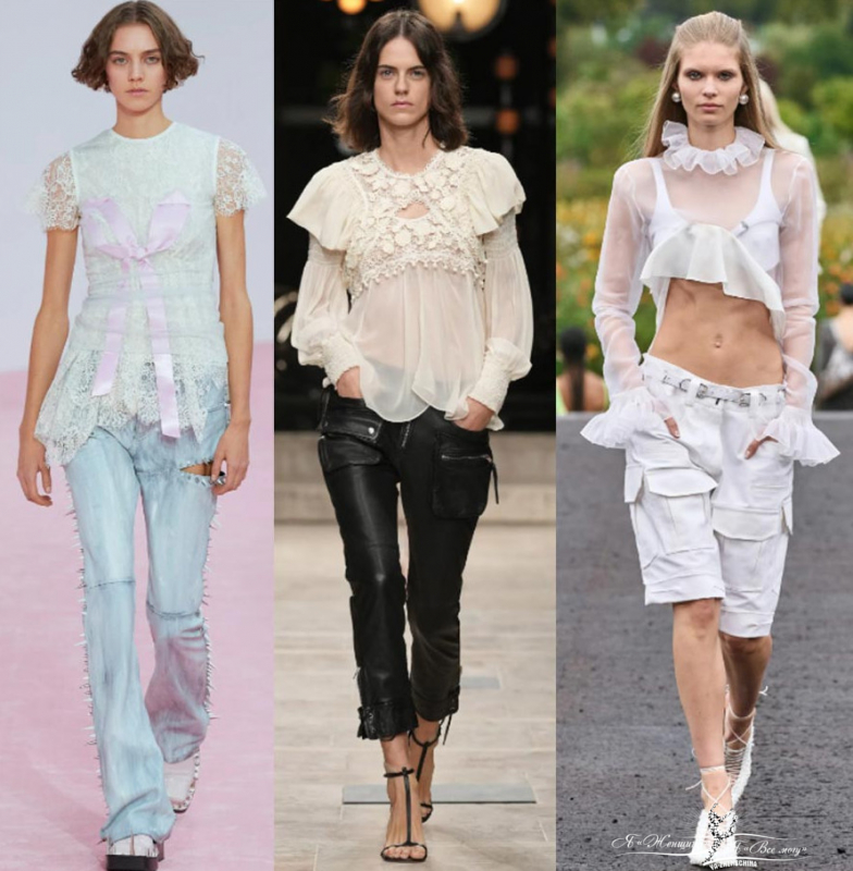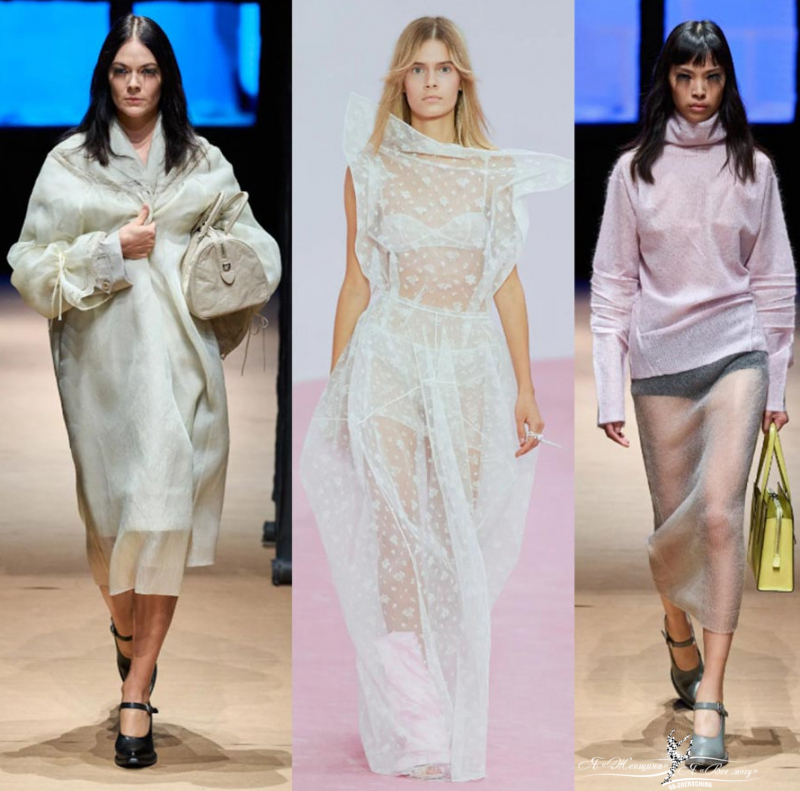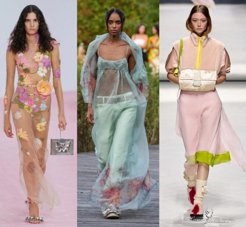 Пастель и полупрозрачные текстуры у брендов Miu Miu, Collina Strada, Fendi. Шикарно смотрятся прозрачные топы с аппликацией в виде цветов. Прозрачность красиво можно обыграть многослойностью. Кажется, что зефирные воздушные текстуры Burberry и Prada для худых и стройных. Многослойность помогает вписать тренд в повседневные образы. Под прозрачную блузу наденьте модную трендовую майку.