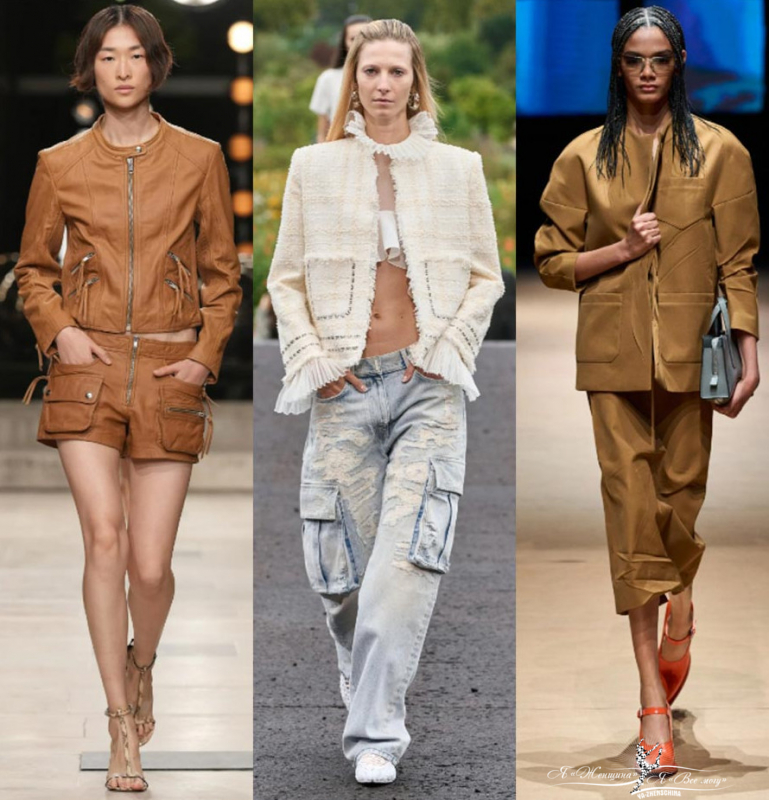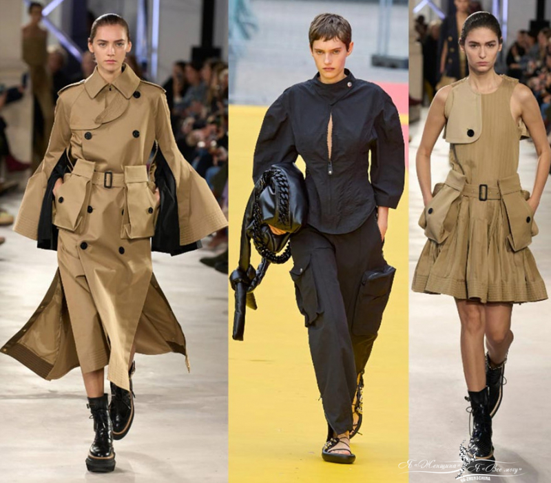 У Stella McCartney карманы на плащах, брюках и шортах. От японского бренда Sacai многие тренды берут свое начало. Удивляет их декоративный вариант с накладными карминами на поясе. У Coperni — классические брюки карго. Понятная вещь для гардероба обычного человека в стиле милитари — урбанистическая куртка цвета хаки.