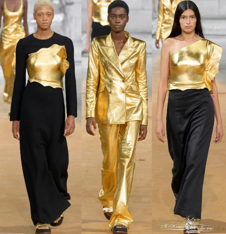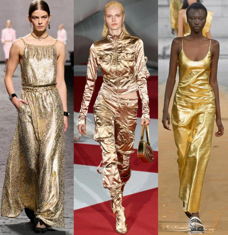 Золота на модных показах у брендов тоже много. На улицах тренд уходит в брюки или сумки.