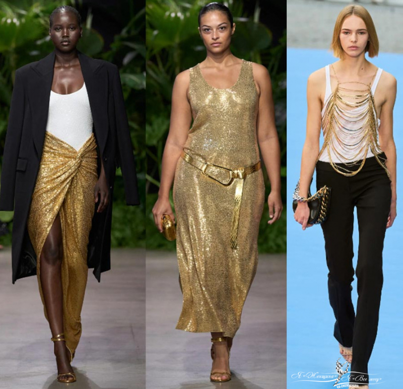 Больше на показах серебристых фактур. Нестандартные металлизированные аксессуары, элементы платья также в тренде. Gabriela Hearst, Stella McCartney — юбки и платья, Michael Kors — юбки с запахом, Coperni — топы, Jacquemus — кожаные брюки.