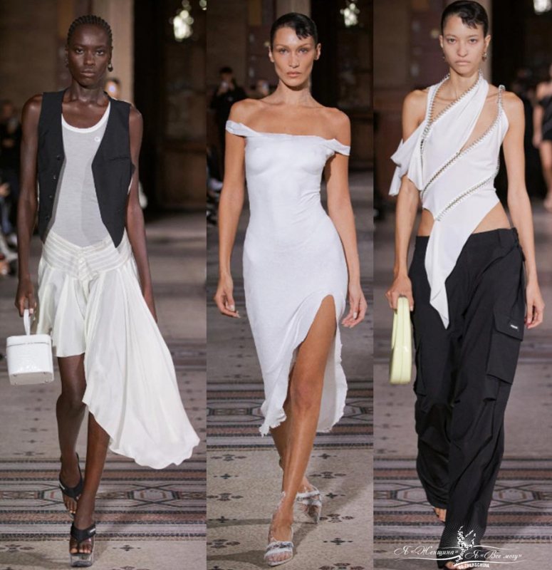 Тренд про асимметрию на юбках и платьях. В тренде платья с одним открытым плечом и с точно такой же диагональной линией на срезе подола. Диагонали у Coperni, Cakai, Michael Kors, Stella McCartney.