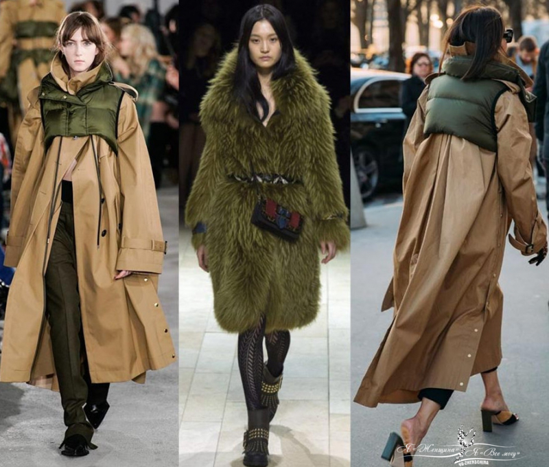 - Длинные плащи и платья цвета хаки;