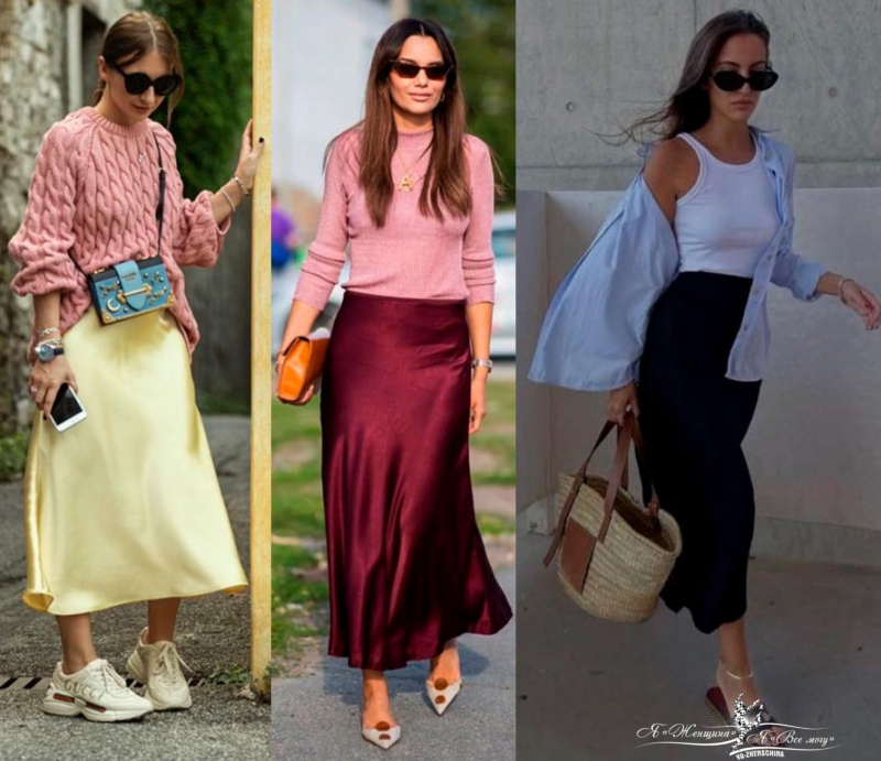 Самая базовая модель — атласные сатиновые юбки в бельевом стиле, слегка расклешенные А-силуэта, скроенные по косой. Эта юбка должна быть из тяжелой ткани, такая модель скрывает особенности фигуры и хорошо садится по бедрам и талии.