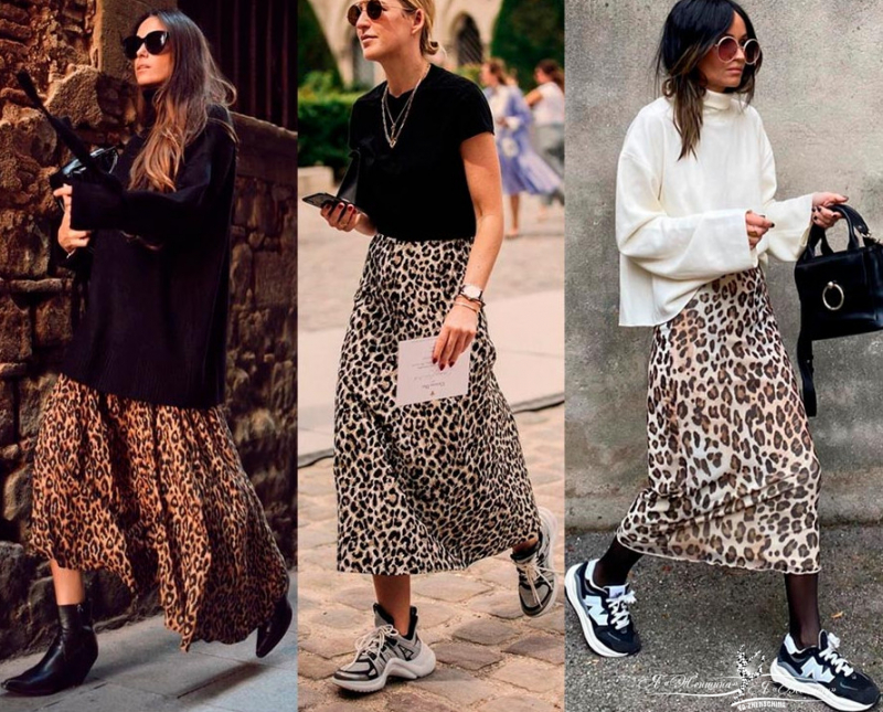 Леопардовый принт не выходит из моды, только его можно в этом сезоне назвать актуальным на длинных юбках.