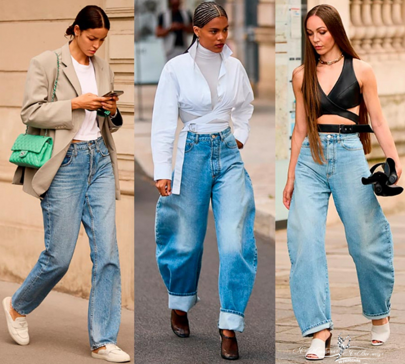 В тренде джинсы сложного кроя, такой крой может визуально делать ноги кривыми, а бедра широкими, но этот дисбаланс компенсирует облегающий верх.