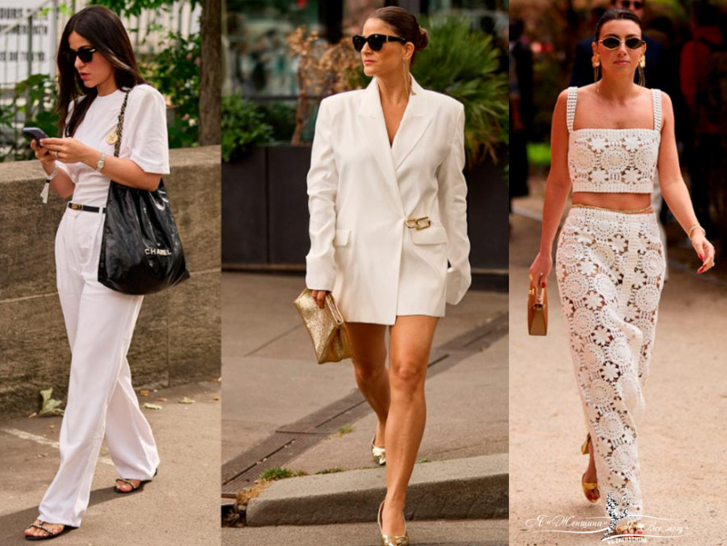 Белый, как и черный, либо уводим в минимализм, либо усложняем фактурой и золотыми аксессуарами.