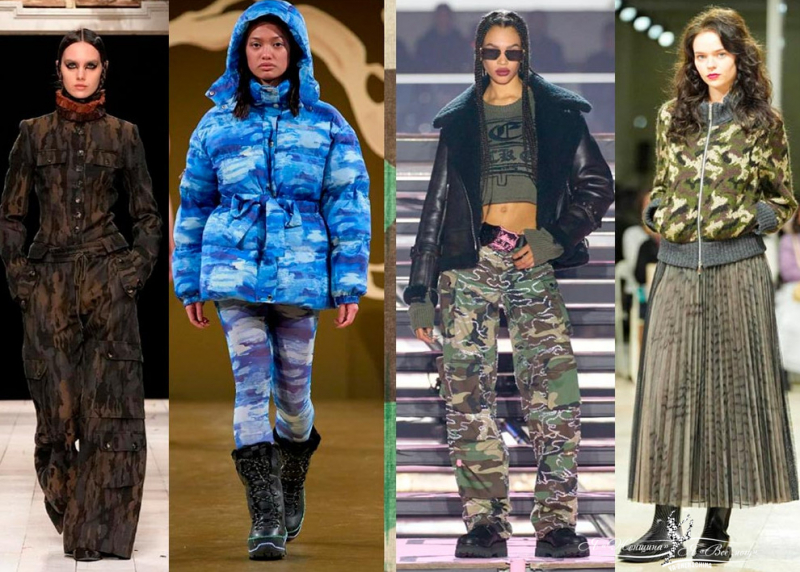 Стрит стайл инфлюенсеры рекомендуют брюки в стиле милитари сочетайте с белой укороченной рубашкой, камуфляжную парку с платьем в цветок, а на модных показах камуфляж сочетают с камуфляжем.