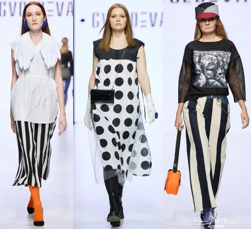 Дизайнер Юлия Гвоздева создает авангардные образы, приправляя крупные базовые принты оранжевым и синим.