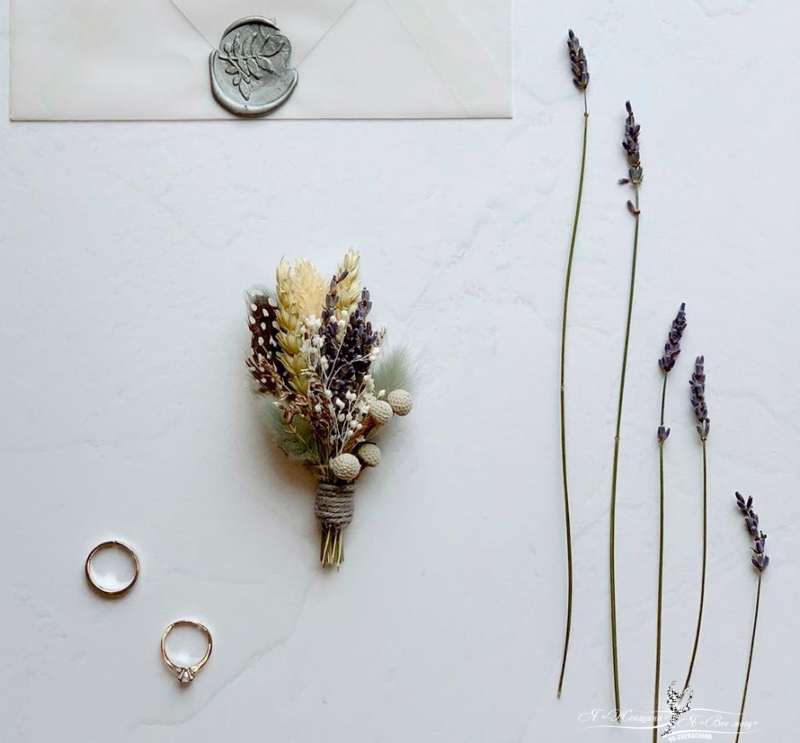 Если вам не хочется стандартных решений, обратите внимание на бутоньерки из сухоцветов, холодного фарфора, полимерной глины или шёлковых лент.