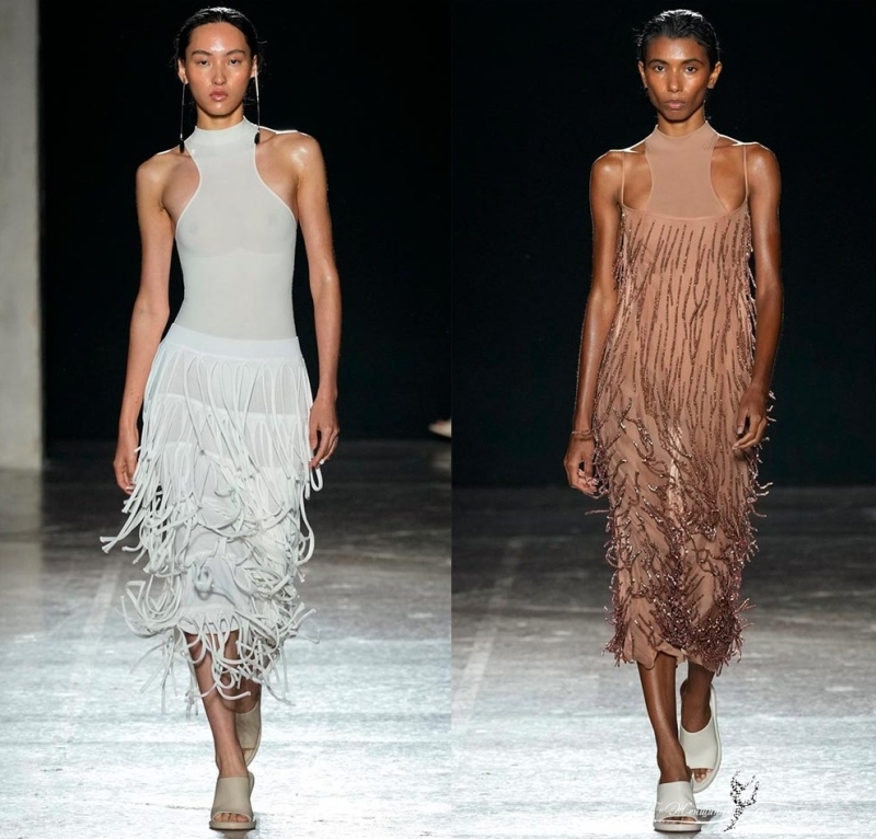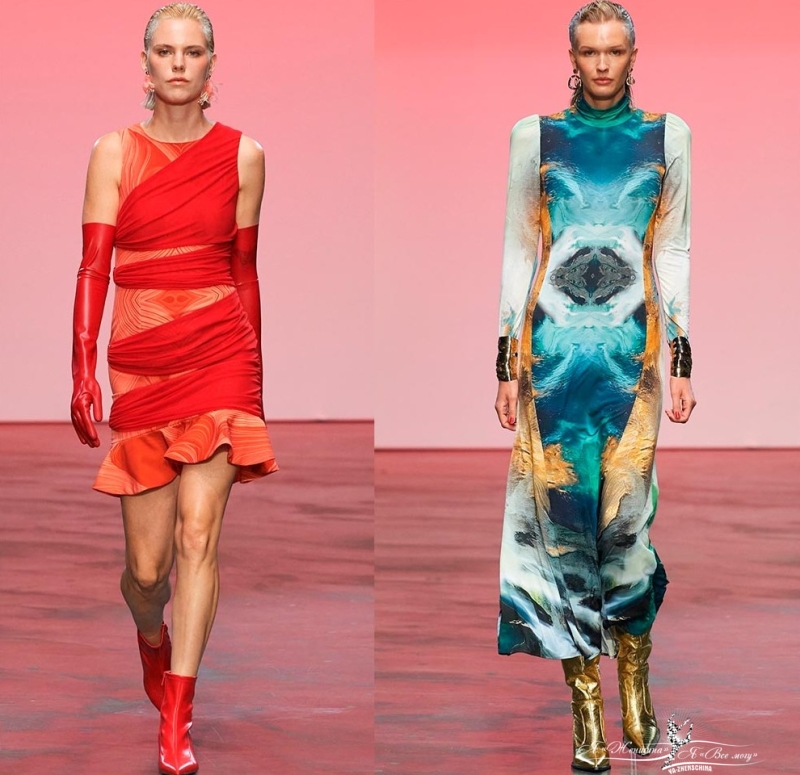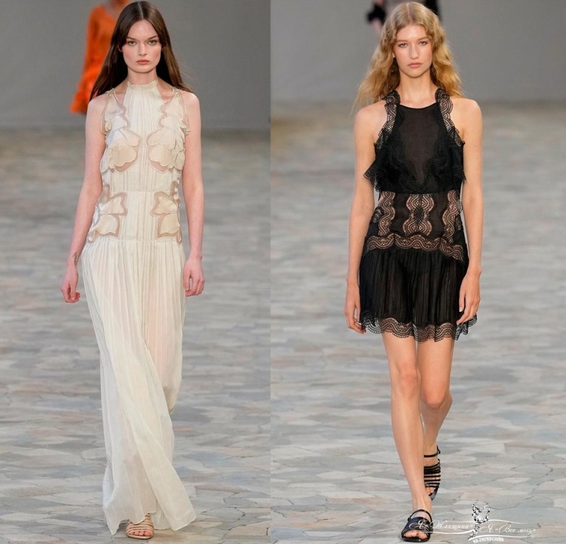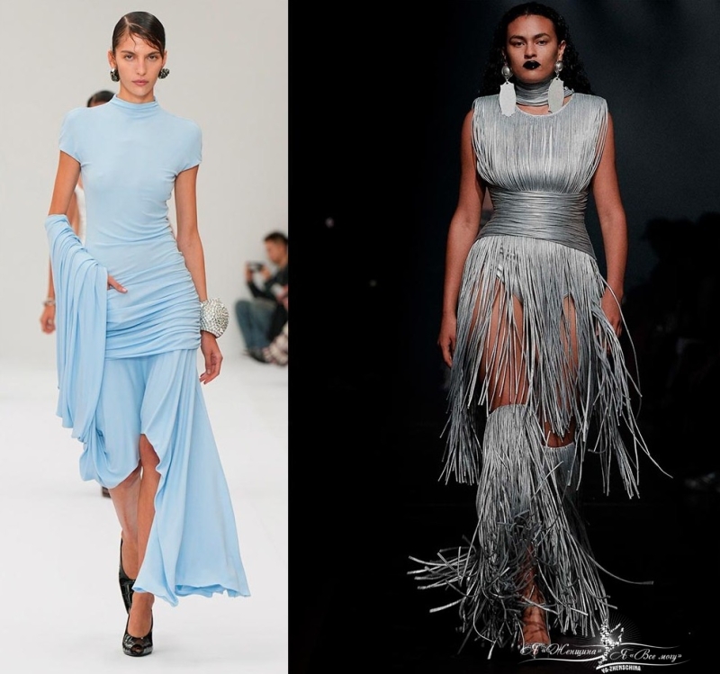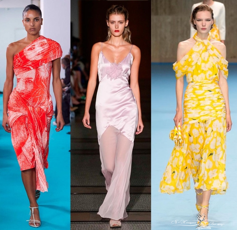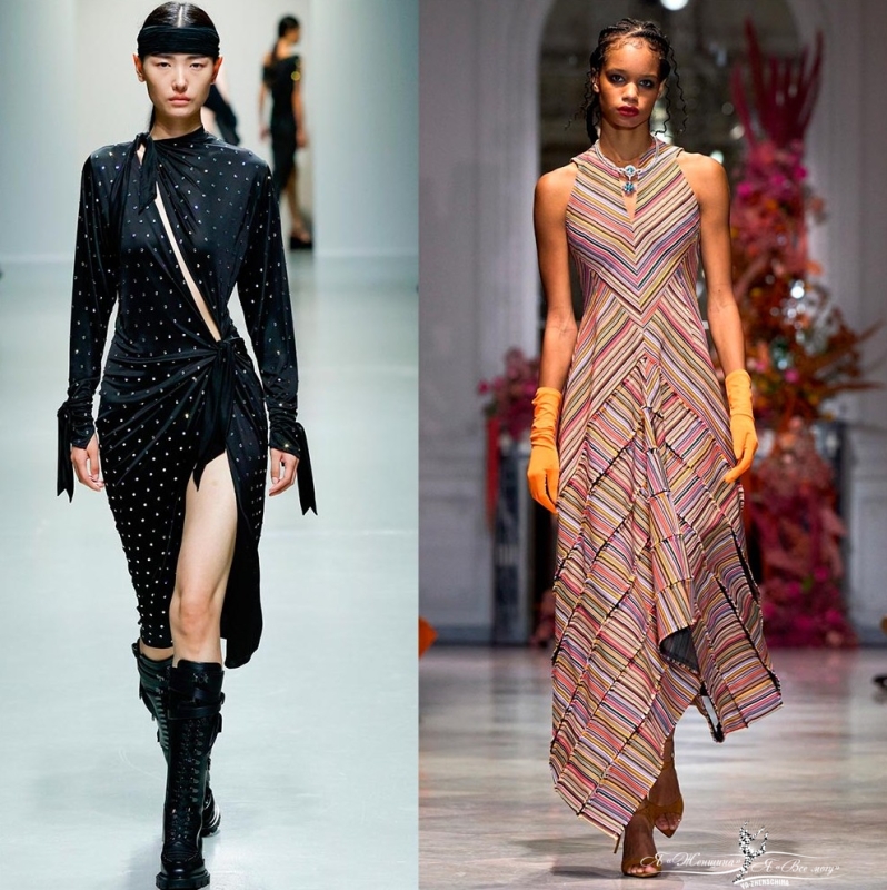 В новом сезоне на пике популярности платья с асимметрией, драпировками, оборками, наряды с бахромой, прозрачные платья, платья-комбинации, свободного кроя и модели с воротником халтер.