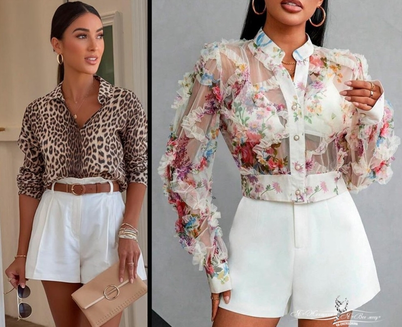 Белые шорты хорошо сочетаются с любой рубашкой, которую следует выбирать по своему желанию – длинную или укороченную модель, свободную или прилегающую. Длинную рубашку можно укоротить, завяз узлом (это подчеркнет талию).