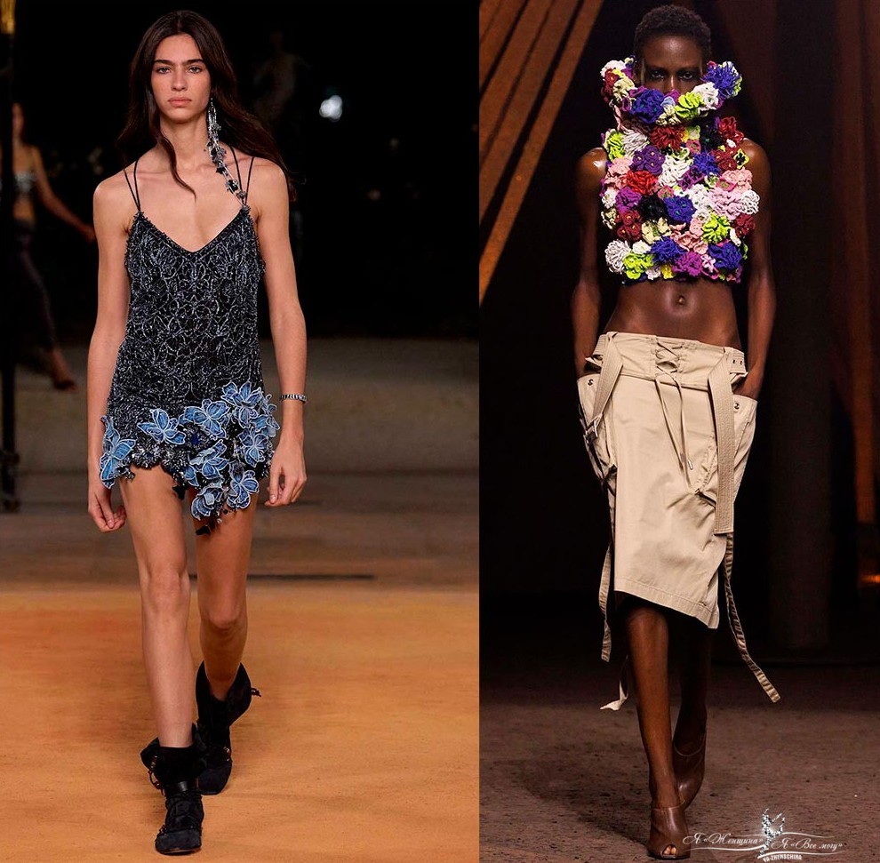 Есть и другие варианты развития модного тренда. Mugler создает цветы непосредственно из материала платья путем драпировки и закручивания. Модный дом Rabanne чтит свои традиции и черпает вдохновение в работах своего создателя, поэтому цветы сверкают металлическим блеском.