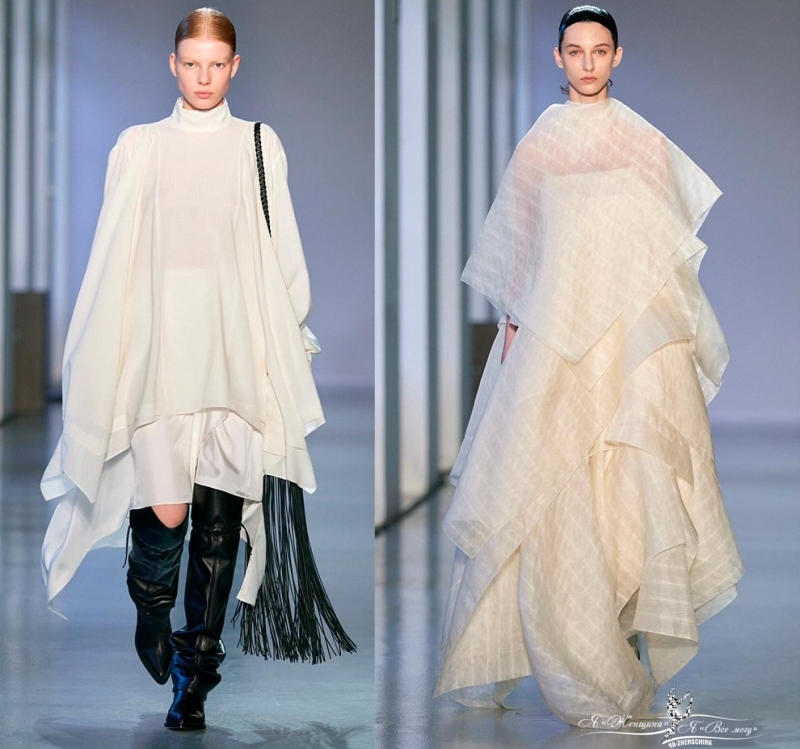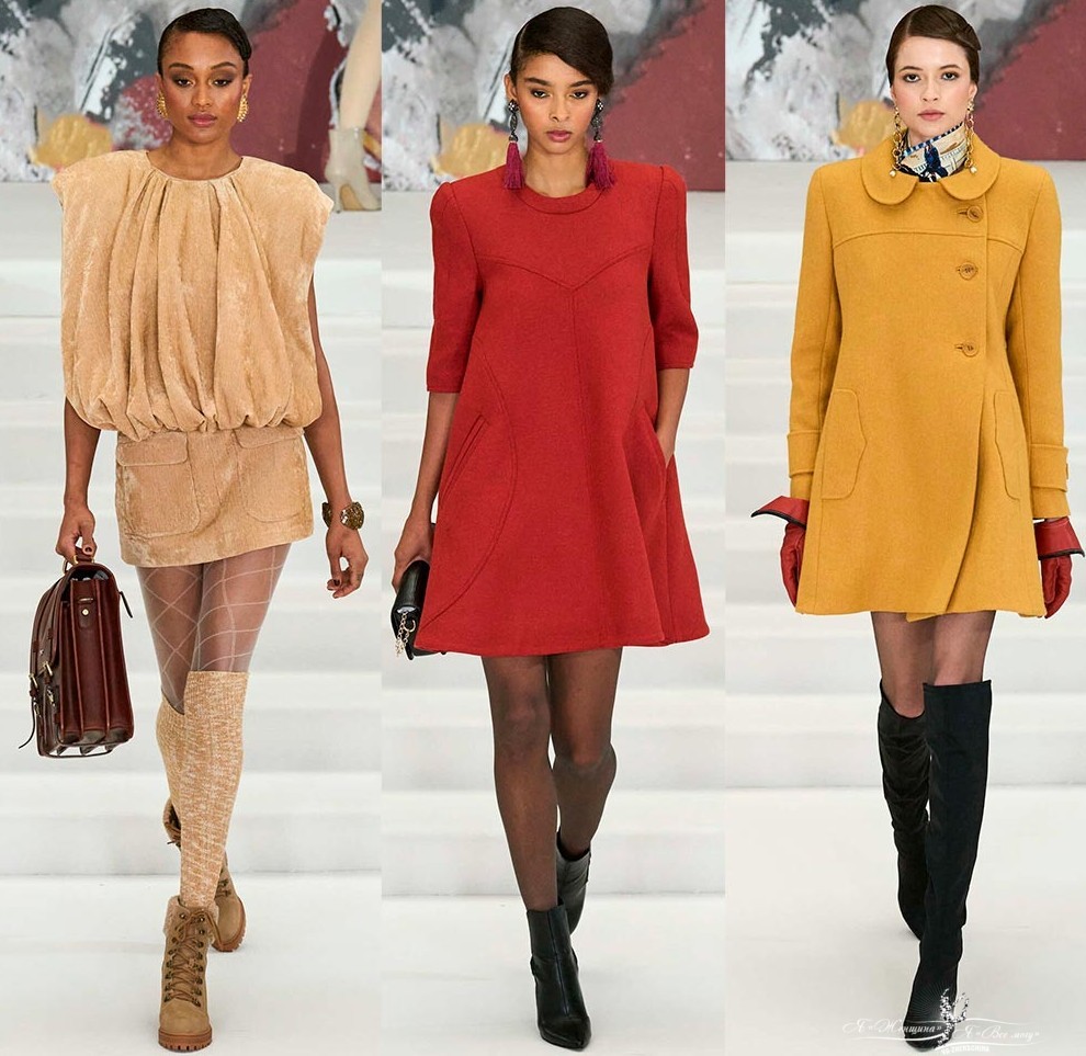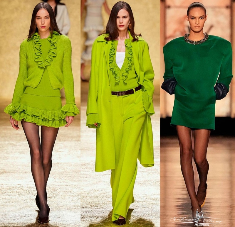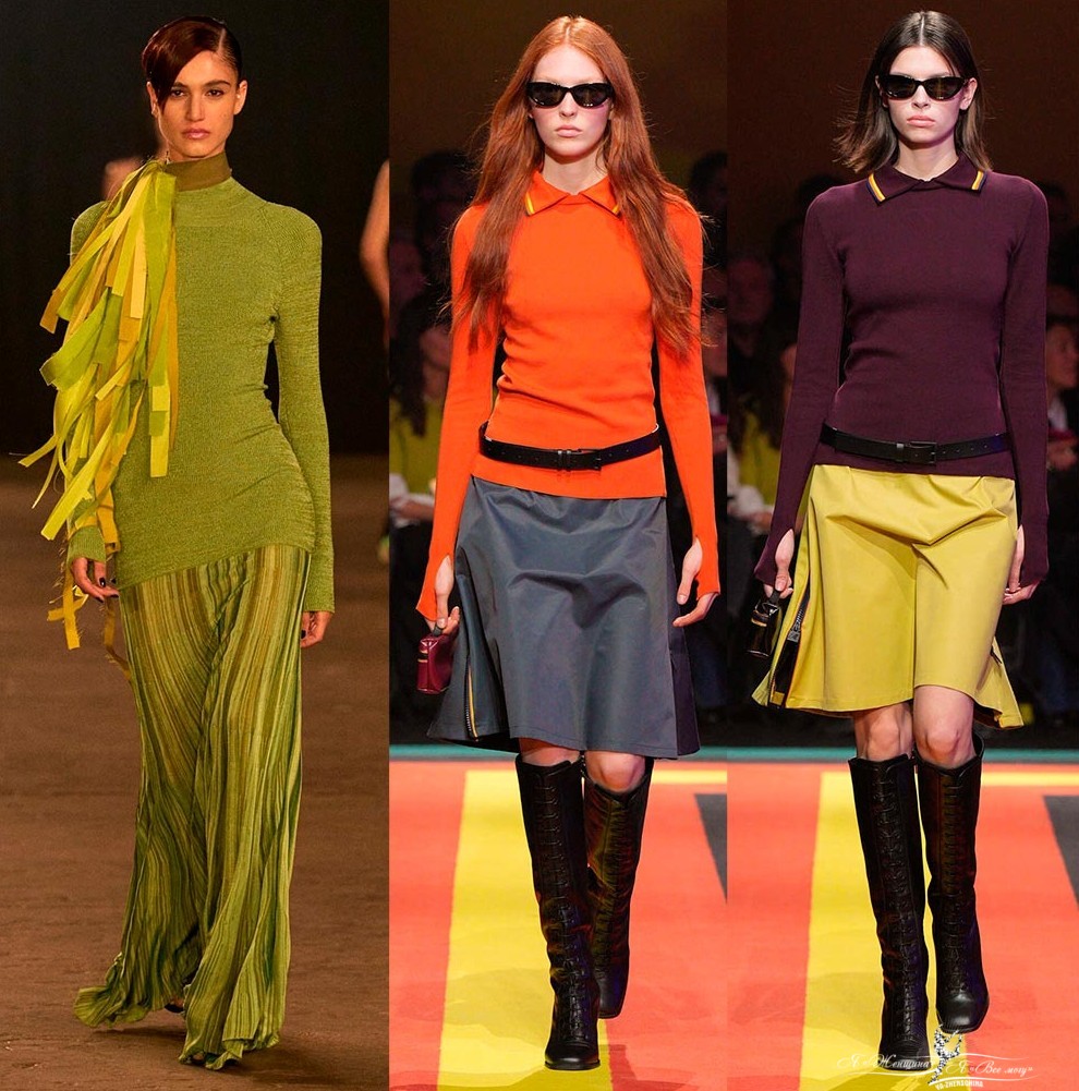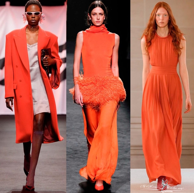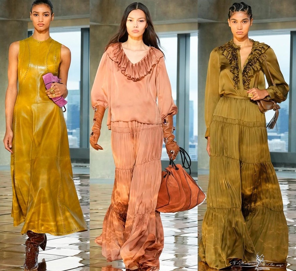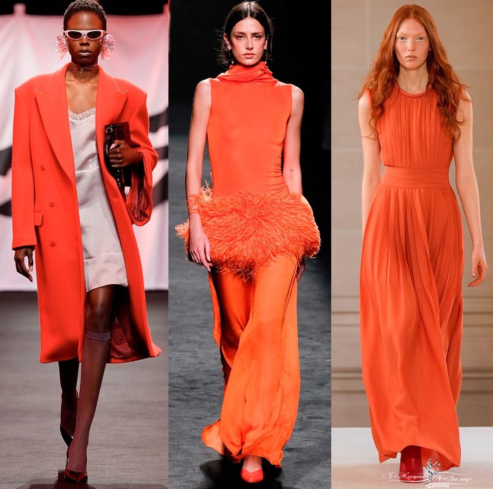 Теплые краски природы особенно впечатляют на восходе или закате солнца, когда небесное светило находится низко над горизонтом, и его лучи будто стелятся по земле. Наряды с теплыми осенними оттенками на подиуме с Недель моды идеально подходят для прогулок по осеннему парку и в утренние, и в вечерние часы.