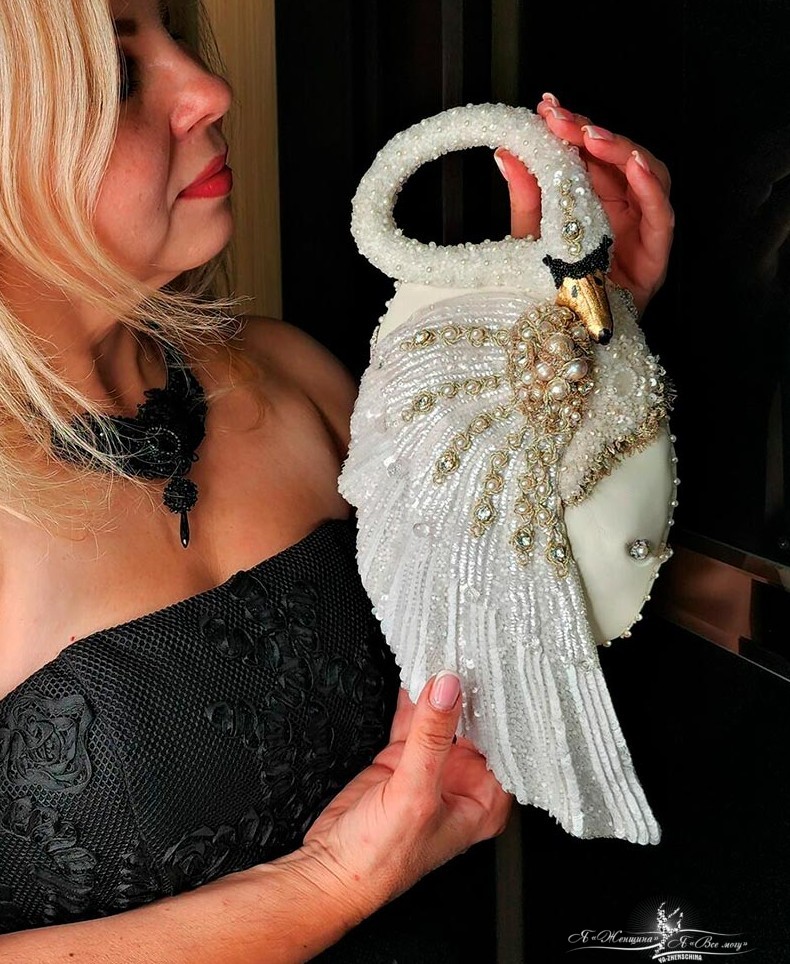 Этот аксессуар неспроста стал победителем конкурса «Мастер года – 2025», ведь это настоящее произведение искусства. Форма лебедя с люневильской вышивкой, жемчугом и кристаллами Swarovski заняла у мастера более 100 часов работы. Она станет акцентом для лаконичного однотонного платья-футляра или вечернего ансамбля, не требуя других ярких украшений.