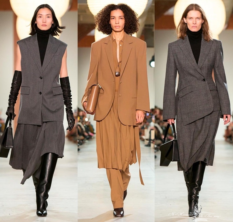 Стильно смотрятся в костюмах асимметричный крой и многослойность, сочетание женственности и строгости, элегантности и дерзости.