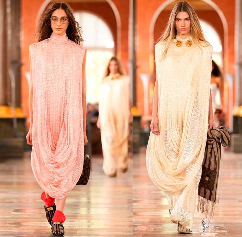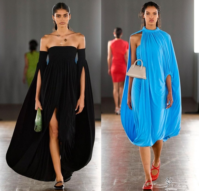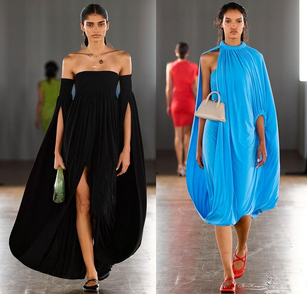 Интересные интерпретации фасона показал бренд Coperni, где рукава также выполнены в подобном крое и сливаются с платьем, образуя форму кокона. Или бренд Louis Vuitton, в коллекции которого платье-баллон приобретает новые и смелые вариации силуэта.