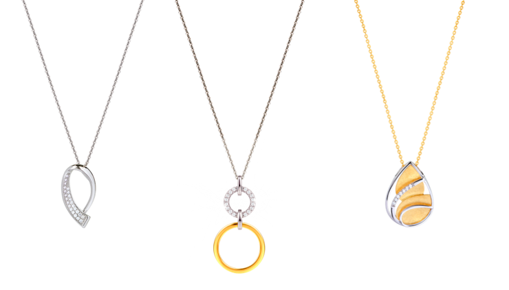 Такие элегантные подвески появились у Bernhard H. Mayer. Кулоны выполнены из белого и желтого золота весом 18 карат и бриллиантов 0,03–0,1 карата, некоторые из них частично покрыты родием. В комплекте к украшениям прилагается позолоченная цепочка.