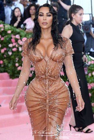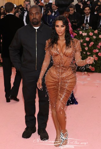 На прошедшем балу Met Gala 2019, который был посвящен стилю кэмп, Ким Кардашьян была без преувеличения одной из самых стильных звезд. На дорожке светская львица предстала в нюдовом латексном платье от Mugler. Максимально облегающее платье было украшено декором из бисера и прозрачных кристаллов, которые имитировали капли воды. Особенно забавно Ким выглядела на фоне своего супруга, рэпера Канье Уэста, который решил в этот вечер не затмевать жену и пришел в крайне непримечательном наряде – простом костюме из бомбера на молнии и прямых брюк (читайте также: 10 самых фантастических звездных образов с Met Gala 2019).