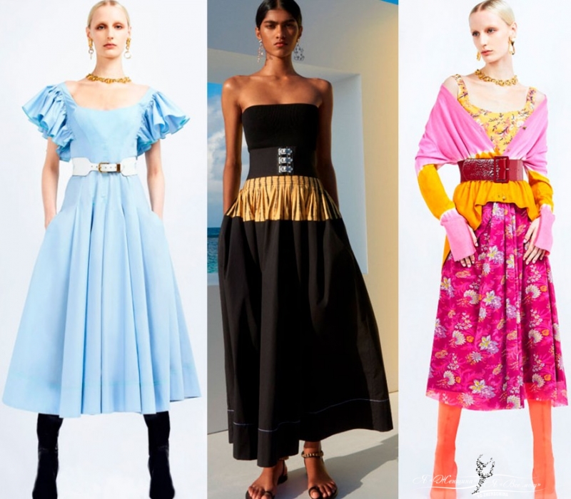У платьев широкие юбки, чтобы не утяжелять низ, нужно на талию завязать широкий пояс. У вещи могут быть пышные рукава, тогда получится силуэт «песочные часы», либо рукава могут полностью отсутствовать, тогда верх будет смотреться хрупким.
