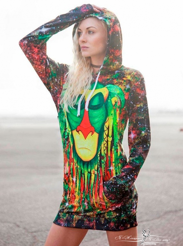 Все зависит от того, как мы хотим преподнести себя, надев платье с капюшоном, то есть, в зависимости от комбинируемых с ним элементов и деталей одежды, а также аксессуаров. Например, это платье можно надеть с джинсами, леггинсами, кроссовками или ботфортами (если платье короткое).